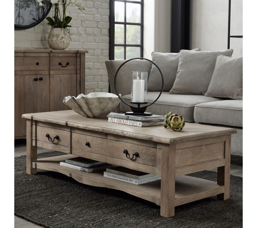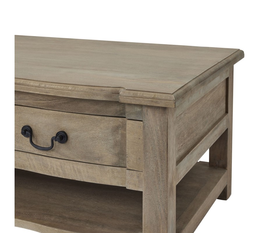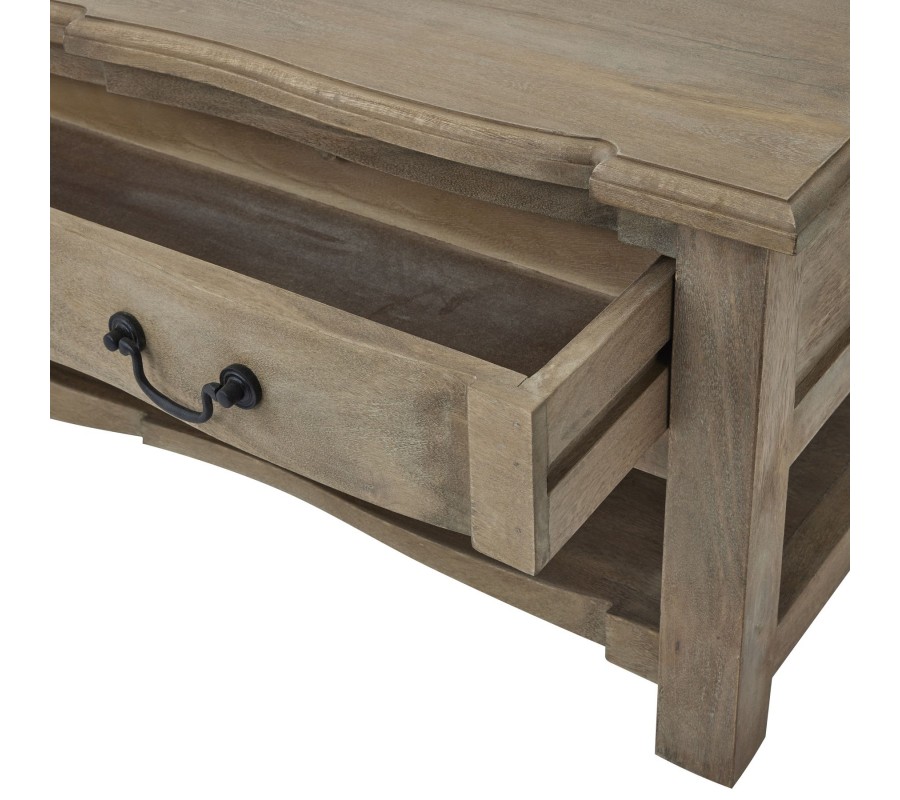 Vidiecky konferenčný stolík Fratemporain svetlohnedej farby z masívneho dreva so zásuvkami a poličkou 140cm