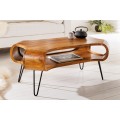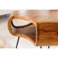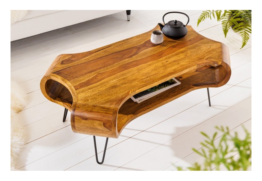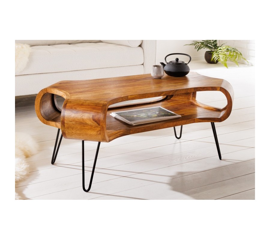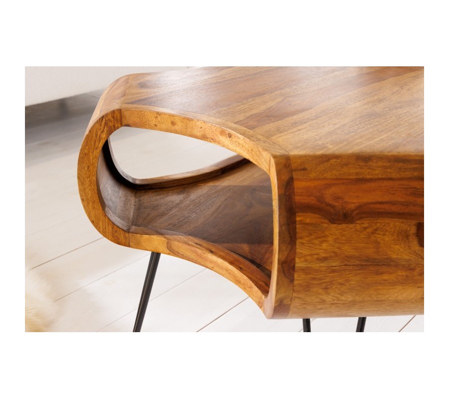 Jedinečný konferenčný stolík Spin zaujme svojím nevšedným dizajnom a originálnym tvarom. Jeho telo je vyrobené z masívneho dreva sheesham a je špecifický najmä vďaka svojmu organickému tvaru so zaoblenými rohmi a otvoreným úložným priestorom. Táto vrchná časť stolíka sa nesie v prírodnej hnedej farbe, pričom povrch je krásne upravený tak, že necháva vyniknúť prirodzenú kresbu masívneho dreva. Tenké čierne kovové nožičky vďaka zaoblenému dizajnu harmonicky dotvárajú celkový vzhľad stola Spin. Otvorenú poličku možno využiť na uskladnenie rôznych kníh, časopisov či iných predmetov, ktoré chcete mať na dosah. Konferenčný stolík Spin vďaka kombinácii masívneho dreva a kovu vhodne zapadne do industriálne ladených obývačiek a vo vašom interiéri dopomôže vytvoriť príjemnú a útulnú atmosféru. Skvelú kombináciu vytvorí napríklad s tmavou čalúnenou koženou sedačkou či kreslom a masívnou obývacou stenou. Vhodné sú tiež rôzne priemyselné doplnky a živé rastlinstvo.