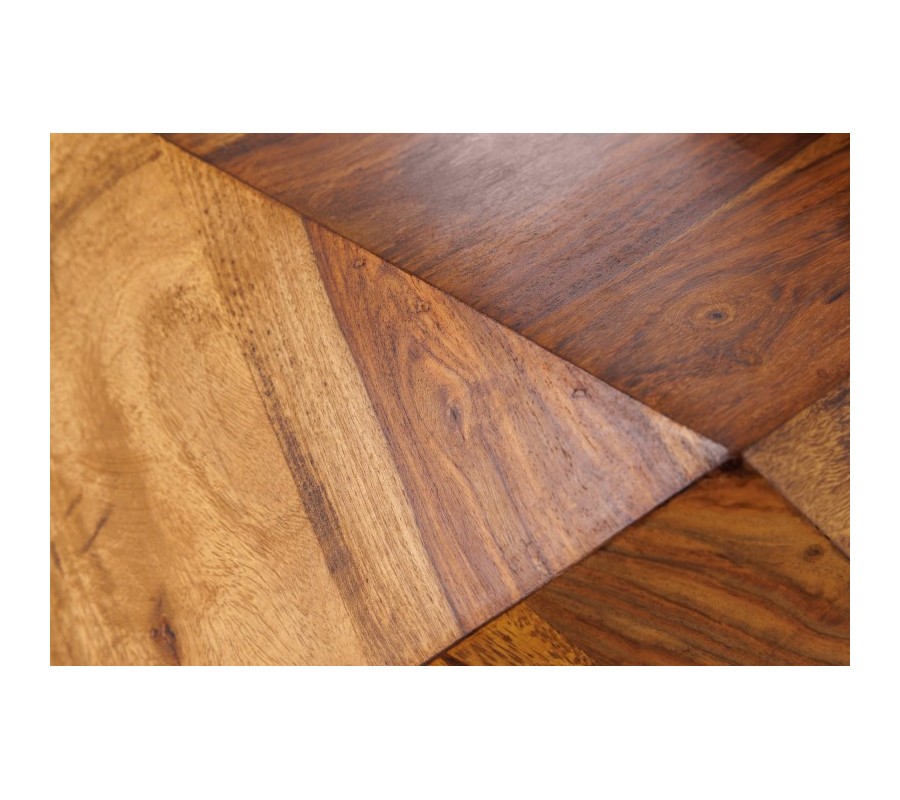 Unikátny tvar konferenčného stolíka Ronan je to, čo na ňom zaujme už na prvý pohľad. Oživte priestory svojej obývačky aj vy týmto originálnym kúskom v tvare diamantu, ktorý je vyrobený z kvalitného masívneho palisandrového dreva! Kombinácia štýlového atypického tvaru a kvalitného materiálu zabezpečuje unikátny vzhľad a dlhú životnosť. Prírodná hnedá povrchová úprava necháva vyniknúť prirodzenú kresbu dreveného masívu, vďaka čomu tento stolík do vašich priestorov vnesie príjemný naturálny nádych. Elegantný, hladko opracovaný povrch z neho robí nadčasový kúsok vhodný na doplnenie moderných, škandinávsky i minimalisticky ladených priestorov obývačiek. Skvele doplní jednofarebné čalúnené sedačky či kreslá a masívnu komodu či TV stolík. Vďaka univerzálnej farebnosti sa však nemusíte báž ani pestrejších dekorácií či rôznych dizajnových doplnkov z kovu alebo skla!