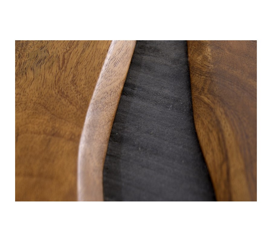 Minimalistický konferenčný stolík v kompaktným rozmeroch poteší nadšencov industriálneho a masívneho nábytku. Vrchná doska obdĺžnikového tvaru, vyrábaná ručne z kvalitného mangového dreva, hrá teplými odtieňmi hnedej prírodnej farby dreva, pričom je podčiarknutá unikátna kresba použitého dreva. Telo stojí na čiernych kovových nožičkách hranatého tvaru do písmena U na oboch stranách, ktoré sú vzájomne prepojené a zabezpečujú dokonalú stabilitu stola aj pri väčšej záťaži. Konferenčný stolík Amazonas je ovzláštnený tmavou bridlicovou dýhou v strede vrchnej dosky. Svoje miesto si nájde v industriálne ladených obývačkách spolu s masívnym nábytkom v podobe TV stolíka či komody. Hnedá farba v kombinácii s čiernou privíta svetlé pastelové farby na zjemnenie interiéru, no nadčasová biela bude rovnako dobrou voľbou. K stolíku sa bude hodiť mnoho kúskov z kolekcie Amazonas z našej ponuky.