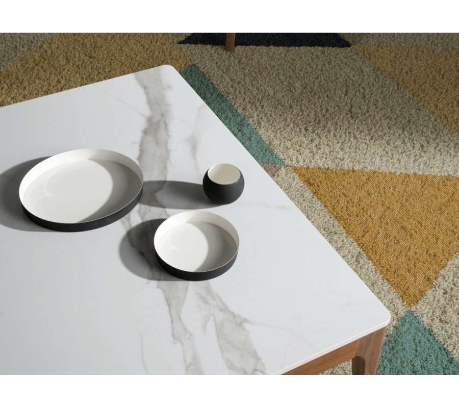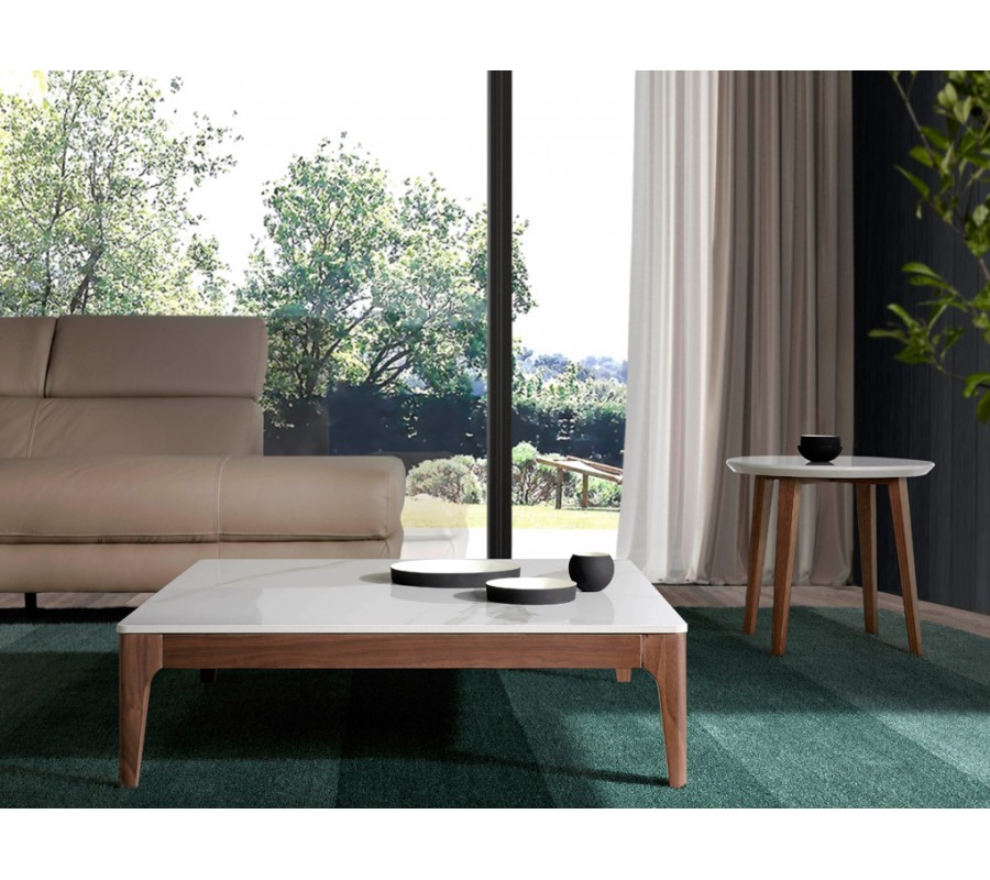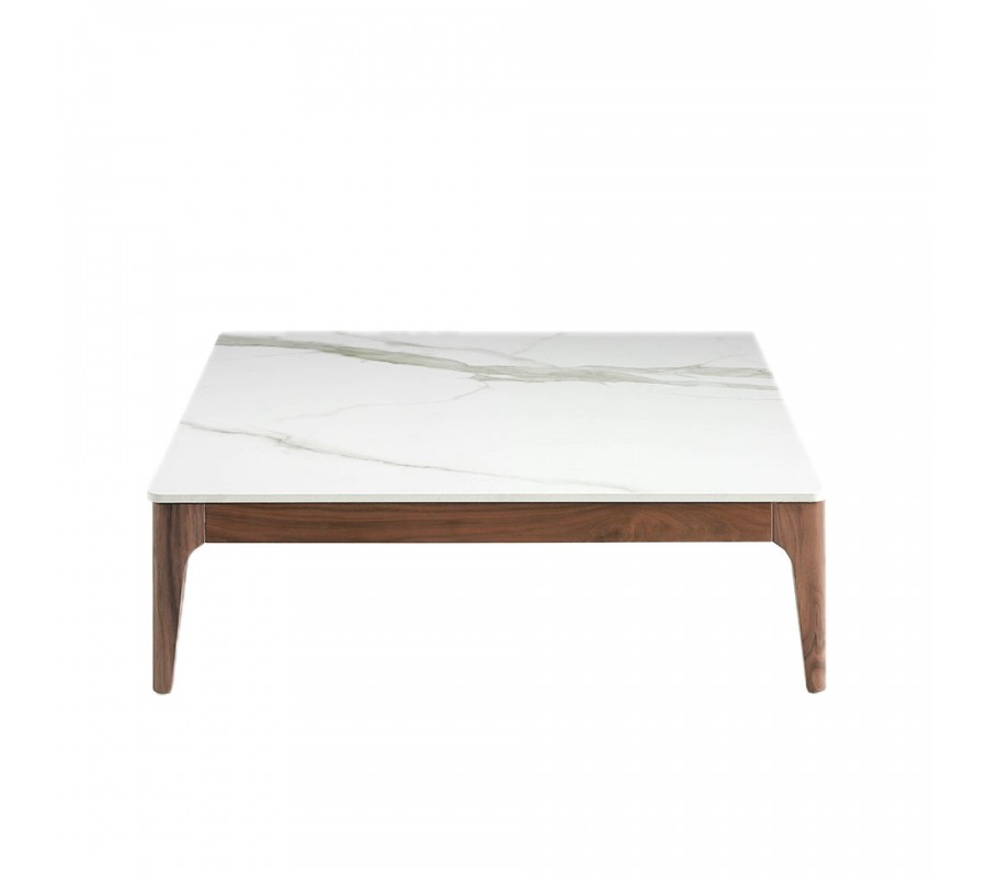 Vrchná doska s fazetovým okrajom a mramorovým vzhľadom krásne vynikne s moderným nábytkom, zatiaľ čo drevené nožičky umožnia kombináciu s lesklým dreveným nábytkom, ktorý dotvorí jedinečnosť Vašej domácnosti.