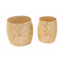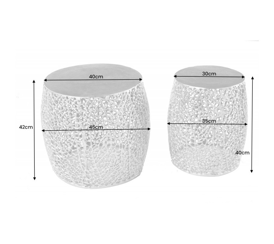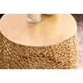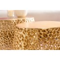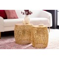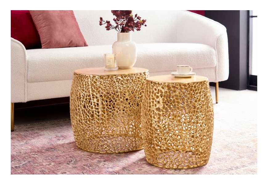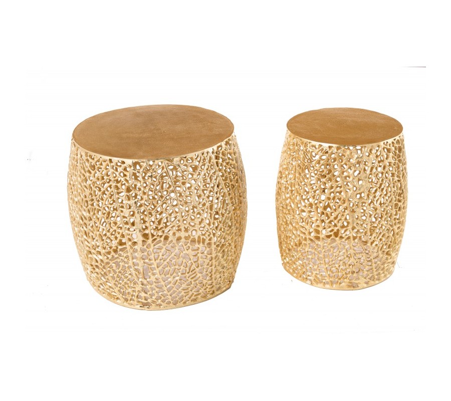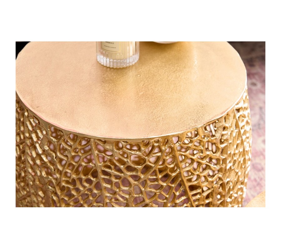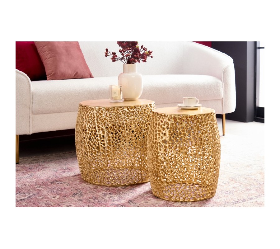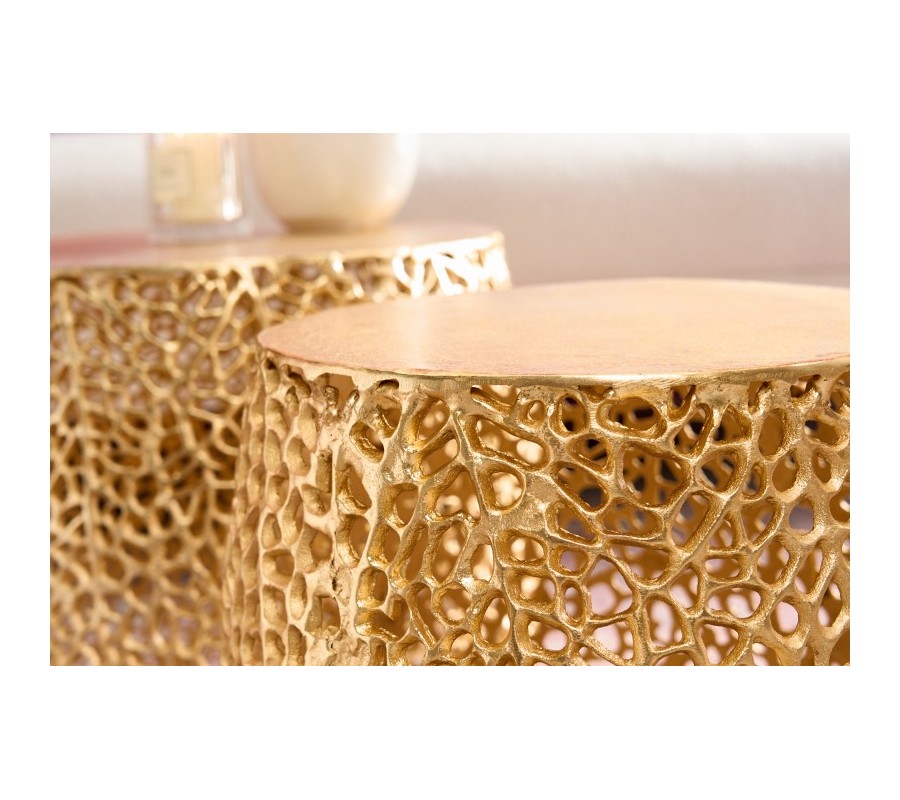 Dizajnový set dvoch konferenčných stolíkov Hoja sa nesie vo výraznej zlatej farbe, ktorá nádherne rozžiari vaše priestory. Stolíky z tejto kolekcie sa vyznačujú svojou zaujímavou spletitou konštrukciou z kovu. Okrúhle zlaté vrchné dosky z kovu dopĺňa zaoblená organická konštrukcia pripomínajúca sieť. Stolíky spolu tvoria skvelý set, ktorý doplní art deco či moderné zamatové sedačky vo vašej obývačke. Vhodne doplnia i priestory hosťovských miestností či reprezentatívne priestory firiem alebo hotelových lobby. Vo vašej miestnosti prakticky poslúžia a zároveň efektne vyniknú a vnesú do nej krásny glamour nádych!