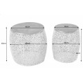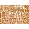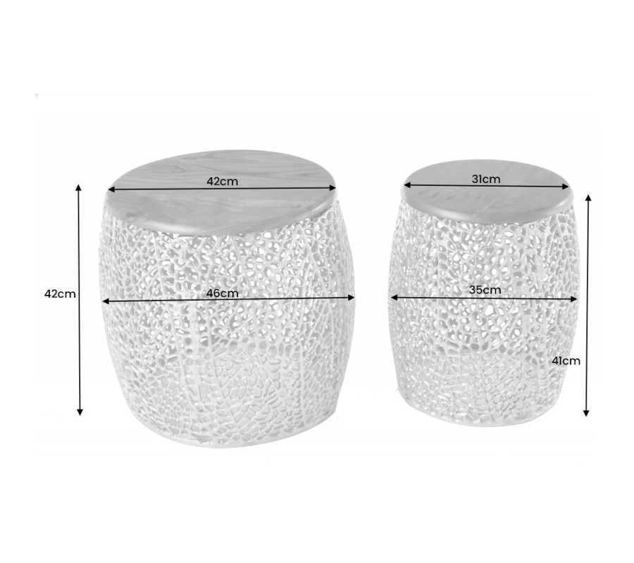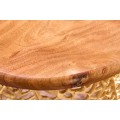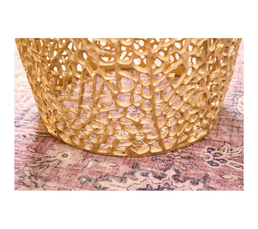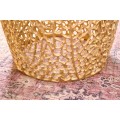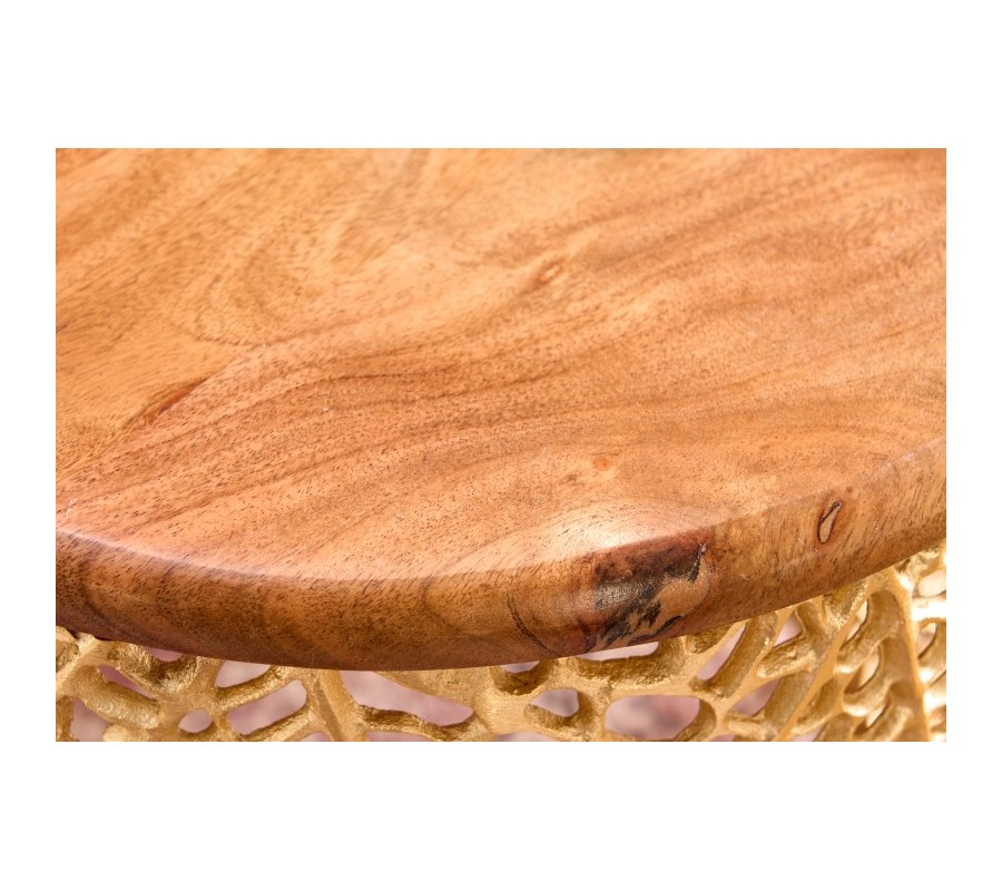 Štýlový set dvoch konferenčných stolíkov Hoja spestrí priestory art deco a glamour ladených interiérov. Stolíky sa vyznačujú svojou sieťovitou konštrukciou v zlatej farbe, ktorá vo vašej miestnosti zažiari. Konštrukcia zaoblených tvarov pôsobí vzdušným dojmom a tak vhodne zapadne i do menších priestorov. Zlatý glamour vzhľad podstavy kontrastne dopĺňajú drevené kruhové vrchné dosky z masívu. Ich prírodná hnedá farba a viditeľná kresba dreva zaujímavo dopĺňa art deco vzhľad stolíkov. Konferenčné stolíky Hoja možno využiť nielen ako set, ale aj oddelene ako príručné stolíky. Vhodnú kombináciu vytvoria s art deco zamatovou či buklé sedačkou alebo kreslom v svetlých krémových odtieňoch. Na umocnenie glamour efektu sú tiež vhodné dekorácie či doplnky v zlatej farbe z kovového materiálu.
