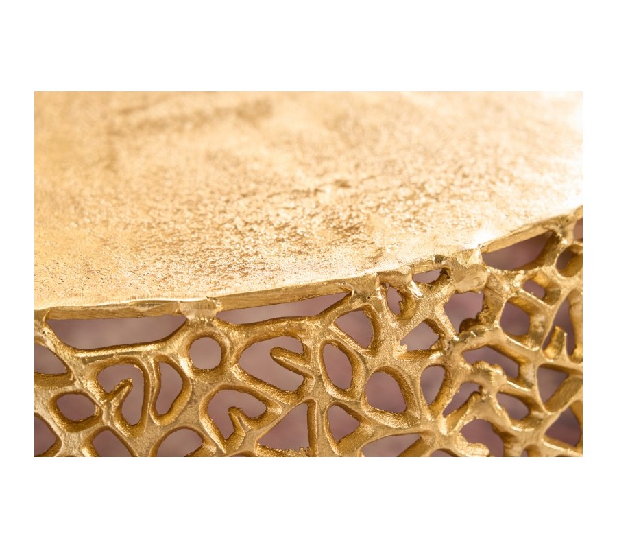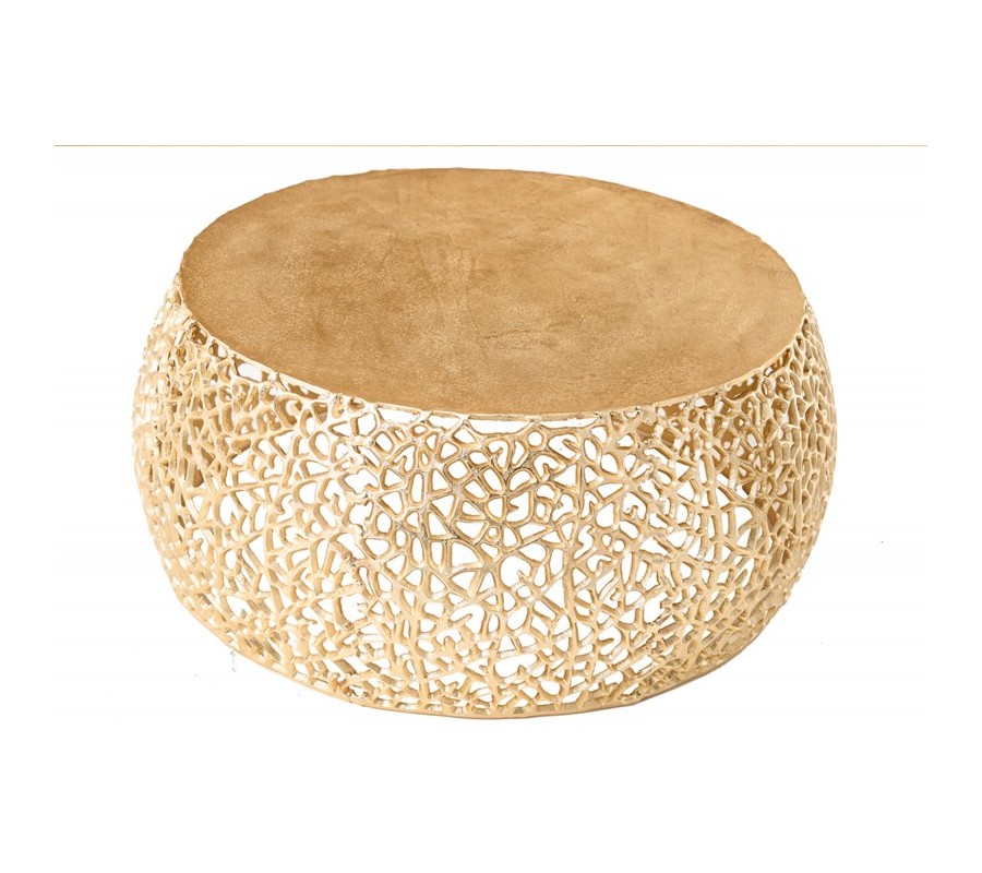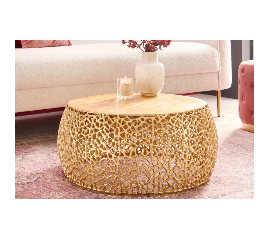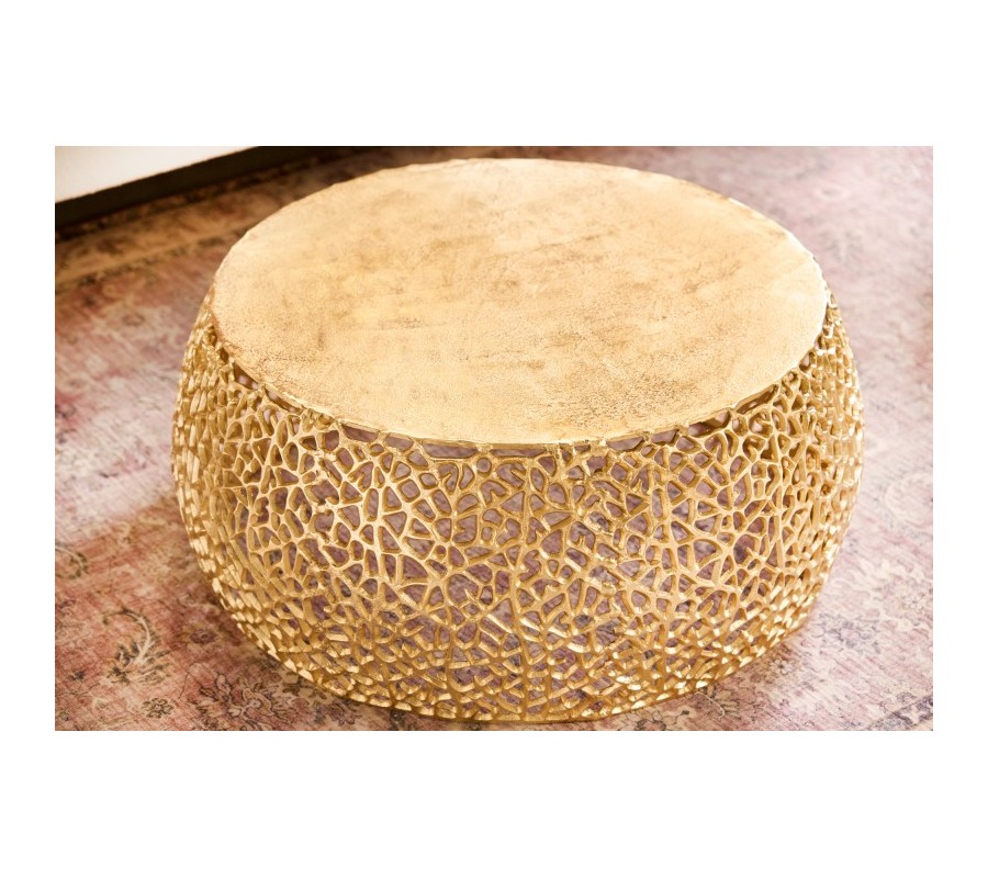 Dizajnový konferenčný stolík Hoja svojim unikátnym vzhľadom zaujme každého milovníka moderných kúskov s nádychom art deco či glamour štýlu. Jeho originalita a jedinečný dizajn spočívajú predovšetkým v organickom okrúhlom tvare a sieťovitej konštrukcii pripomínajúcej štruktúru listu. Stolík je vyrobený z kovu a nesie sa v zlatej farbe, ktorá vašu miestnosť nádherne rozžiari, či už ide o svetlejší alebo tmavšie ladený priestor. Unikátny dizajn konferenčného stolíka Hoja dodá vášmu interiéru vzdušný efekt a elegantný glamour nádych. Vďaka ručnej výrobe je každý jeden kúsok originál. Konferenčný stolík Hoja sa hodí k zamatovým sedačkám či kreslám vo výrazných farbách, rovnako ako aj ku krémovej buklé či ľanovej sedačke s akcentom v podobe zlatých nožičiek. Vhodné farebné kombinácie sú smaragdovozelená, staroružová či krémová. Art deco nádych umocníte tiež rôznymi zlatými doplnkami z kovu či sklenenými dekoráciami geometrických tvarov.