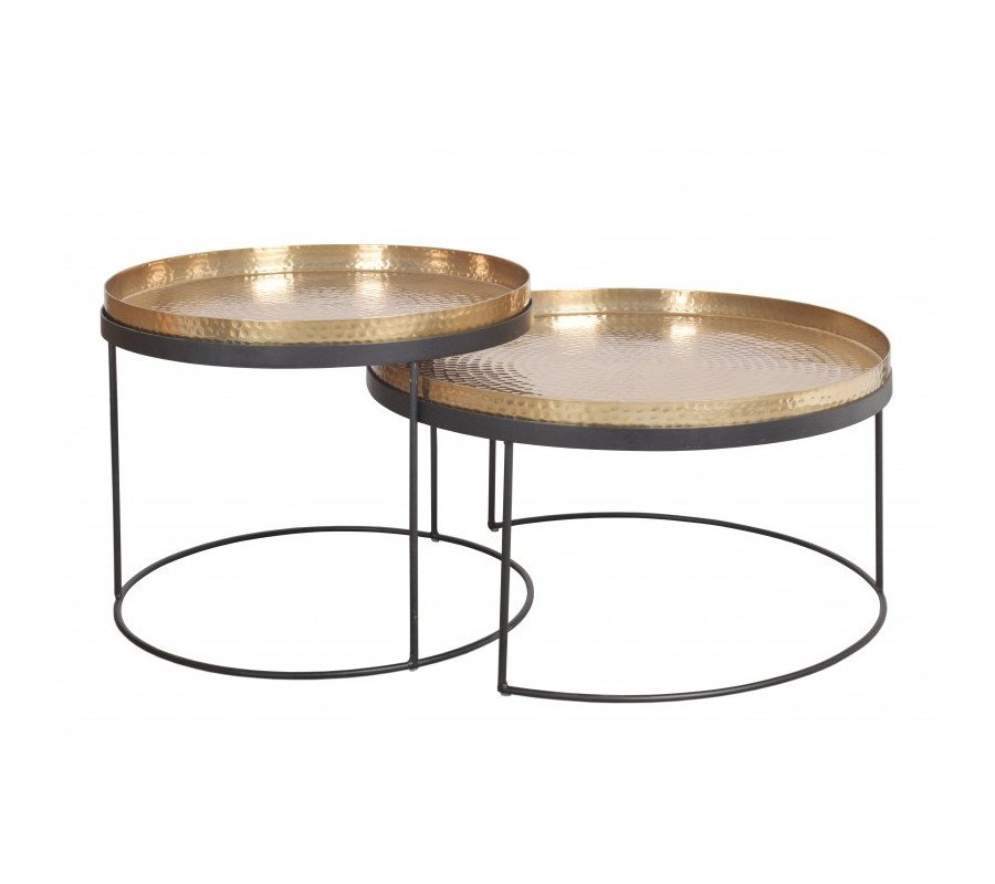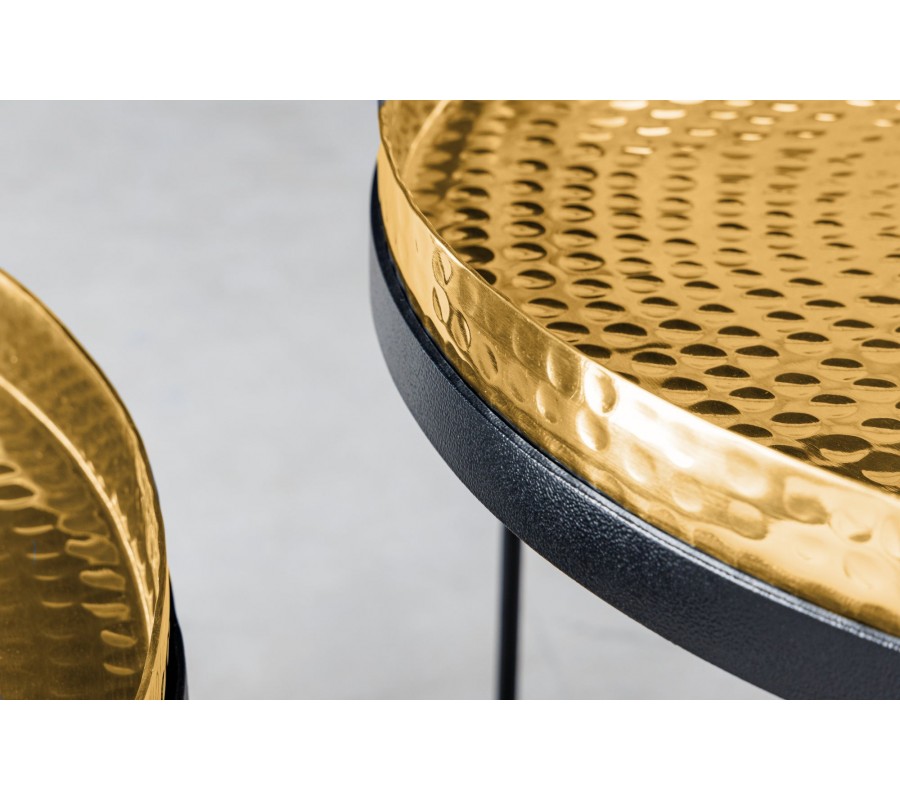 Set stolíkov Elements Vás zaujme štýlovým prevedením vrchných dosiek v zlatom kovovom prevedení, ktoré na seba zaručene upútajú pozornosť. Výrazné zlaté prevedenie doplní konštrukcia s tromi nožičkami zo železa, ktoré je obohatené o práškový nástrek v čiernej farbe, vďaka ktorému vznikne jemný nádych industriálneho štýlu. Vyhotovenie kovových nožičiek Vám umožňuje kombinovať set ako dva separátne stolíky, alebo ako spoločný set stolíkov, ktoré do seba zapadnú vďaka otvorenému priestoru konštrukcie.