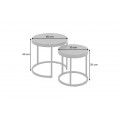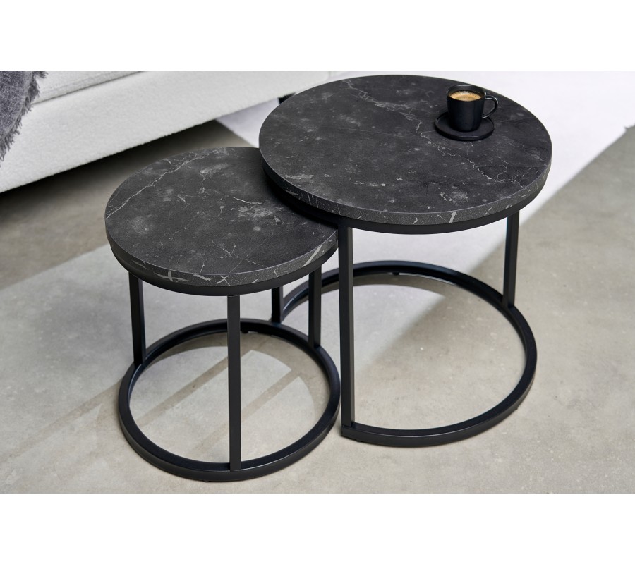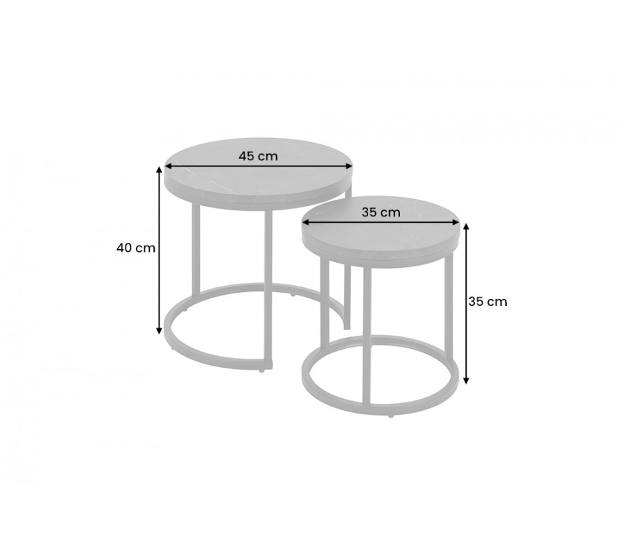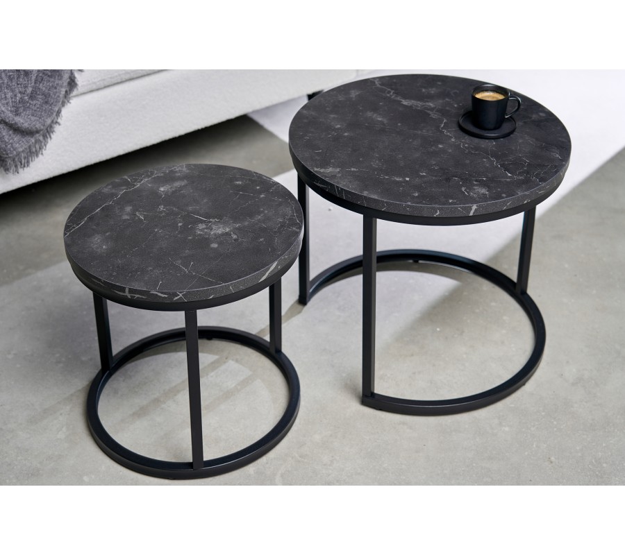 Štýlový set dvoch konferenčných stolíkov Nadja predstavuje vynikajúce riešenie na doplnenie industriálne či moderne ladených obývačiek. Stolíky možno využiť ako set, ale aj jednotlivo, podľa možností vašich priestorov. Oba stolíky disponujú pevnou kovovou konštrukciou čiernej farby, ktorá zabezpečuje výbornú stabilitu a vnáša do ich dizajnu industriálny nádych. Podstava je doplnená drevenými okrúhlymi vrchnými doskami s mramorovou úpravou v čierno-bielom prevedení. Vzniká tak unikátny, vysoko elegantný vzhľad, ktorý príjemne doplní vaše priestory a svojím vzdušným efektom dopomôže k optickému zväčšeniu miestnosti. Vďaka univerzálnej farebnosti setu je možné stolíky umiestniť do chromaticky, ale i do pestrejšie ladených miestností. Materiál kovu spolu s mramorovým efektom sa bude nádherne dopĺňať so zamatovou čalúnenou sedačkou a kreslom a nábytkom v industriálnom, modernom či art deco štýle. Set stolíkov Nadja odporúčame doladiť aj výraznými dekoráciami a kontrastnými farebnými doplnkami vo výraznej tmavozelenej, horčicovožltej či kráľovskej modrej farbe.