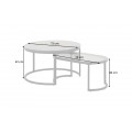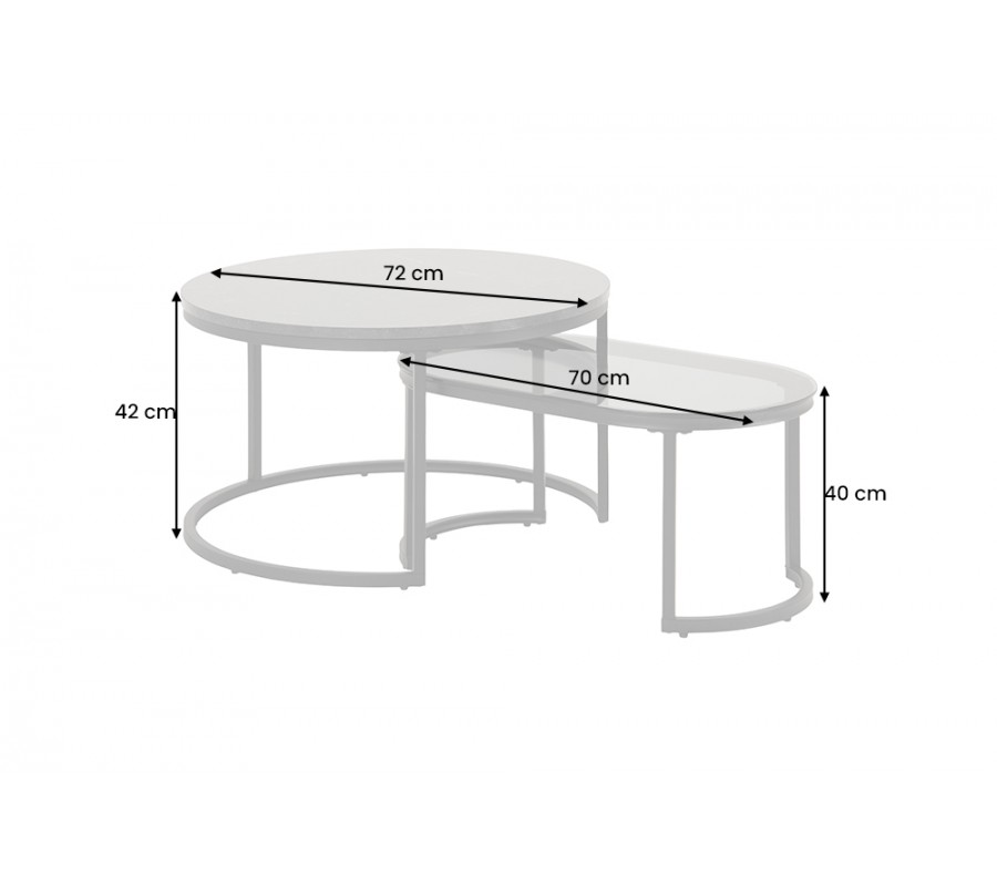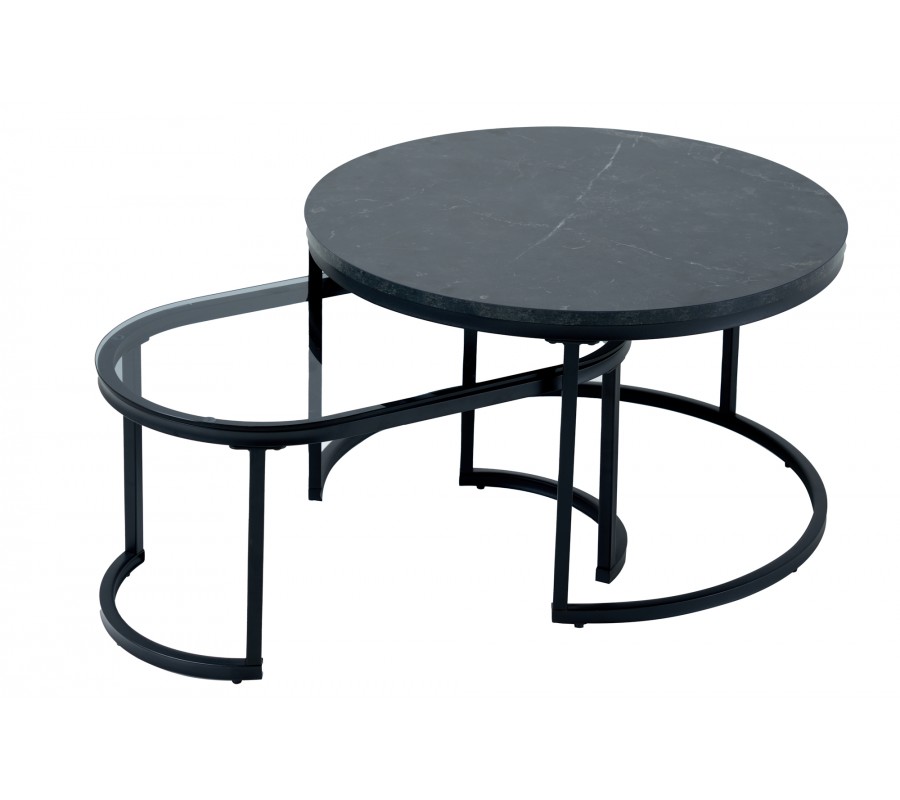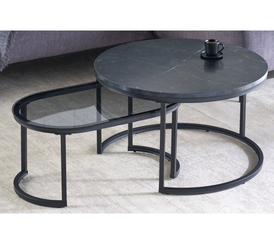 Štýlový set dvoch konferenčných stolíkov Nadja predstavuje vynikajúce riešenie na doplnenie industriálne či moderne ladených obývačiek. Stolíky možno využiť ako set, ale aj jednotlivo, podľa možností vašich priestorov. Nižší stolík oválneho tvaru tvorí konštrukcia z kovu v čiernej farbe a sklenená vrchná doska. Vyšší stolík kruhového tvaru disponuje rovnakou kovovou konštrukciou, no jeho vrchná doska je vyrobená z dreva s mramorovým efektom. Vzniká tak unikátny, vysoko elegantný vzhľad, ktorý príjemne doplní vaše priestory a svojím vzdušným efektom dopomôže k optickému zväčšeniu miestnosti. Vďaka univerzálnej farebnosti setu je možné stolíky umiestniť do chromaticky, ale i do pestrejšie ladených miestností. Materiál kovu a skla spolu s mramorovým efektom sa bude nádherne dopĺňať so zamatovou čalúnenou sedačkou a kreslom a nábytkom v industriálnom, modernom či art deco štýle. Set stolíkov Nadja odporúčame doladiť aj výraznými dekoráciami a kontrastnými farebnými doplnkami vo výraznej tmavozelenej, horčicovožltej či kráľovskej modrej farbe.