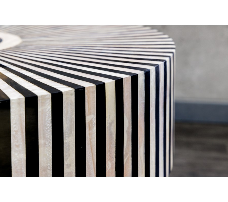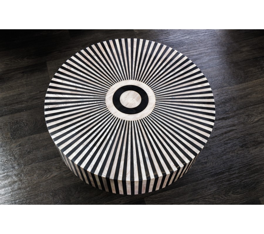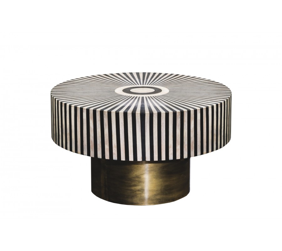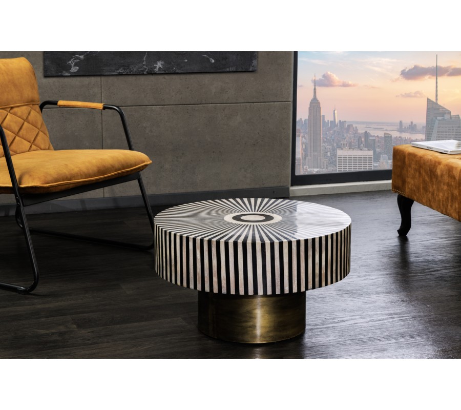 Art deco okrúhly konferenčný stolík Hypnotique s čiernobielym kosťovým ozdobným vykladaním a podstavou v zlatej farbe 60 cm