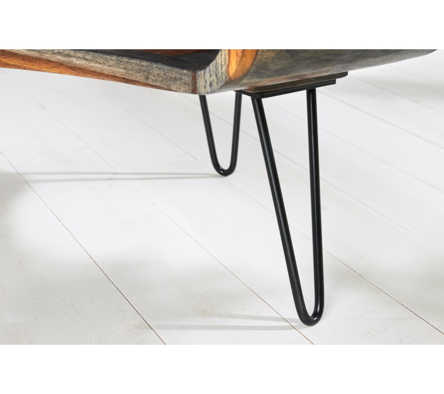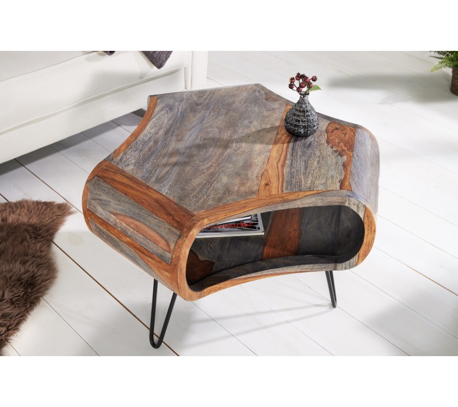Dizajnový konferenčný stolík Spin predstavuje unikátny a nevšedný kúsok nábytku, ktorý je ideálny pre milovníkov masívneho dreva a retro štýlu. Tento stolík sa vyznačuje svojím originálnym a nezvyčajným tvarom, ktorý je ďalej zvýraznený zaobleným dizajnom s rezanými bokmi. Tento špecifický tvar nielenže dodáva stolíku vizuálnu atraktivitu, ale tiež ponúka praktický odkladací priestor, ktorý je ideálny pre uschovávanie drobných predmetov, časopisov alebo kníh. Stolík je vyrobený z kvalitného masívneho dreva sheesham, známeho svojou odolnosťou a jedinečnou textúrou. Na dreve môžeme obdivovať jeho zaujímavú a príťažlivú kresbu, ktorá každý kúsok robí jedinečným. Prírodná hnedá farba dreva, ktorá je doplnená o šedé zafarbenie, vytvára teplý a prívetivý vzhľad, ktorý krásne vyniká najmä v svetlejších interiéroch. Tento farebný odtieň poskytuje stolíku eleganciu a sofistikovanosť a zároveň ho robí všestranným kúskom, ktorý sa hodí do mnohých dekoratívnych štýlov. Konferenčný stolík Spin je teda nielen vizuálne príťažlivý, ale tiež praktický a funkčný. Jeho jedinečný tvar a kombinácia materiálov robia tento stolík ideálnym doplnkom pre obývačky zariadené v retro alebo industriálnom štýle..