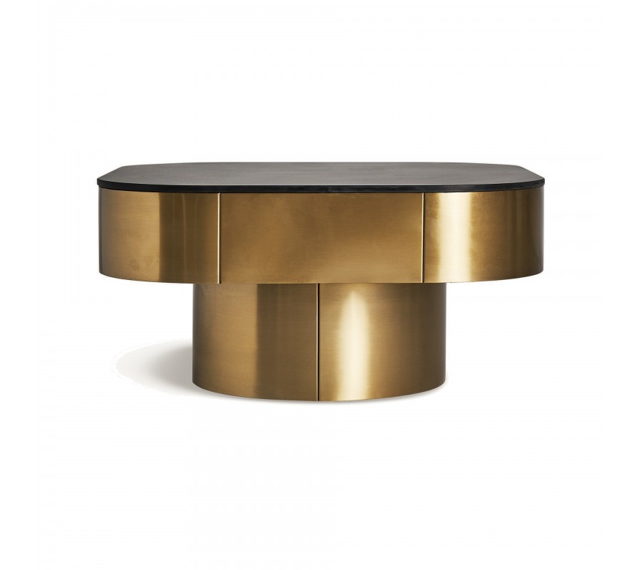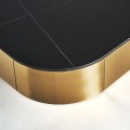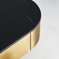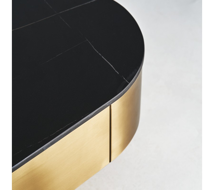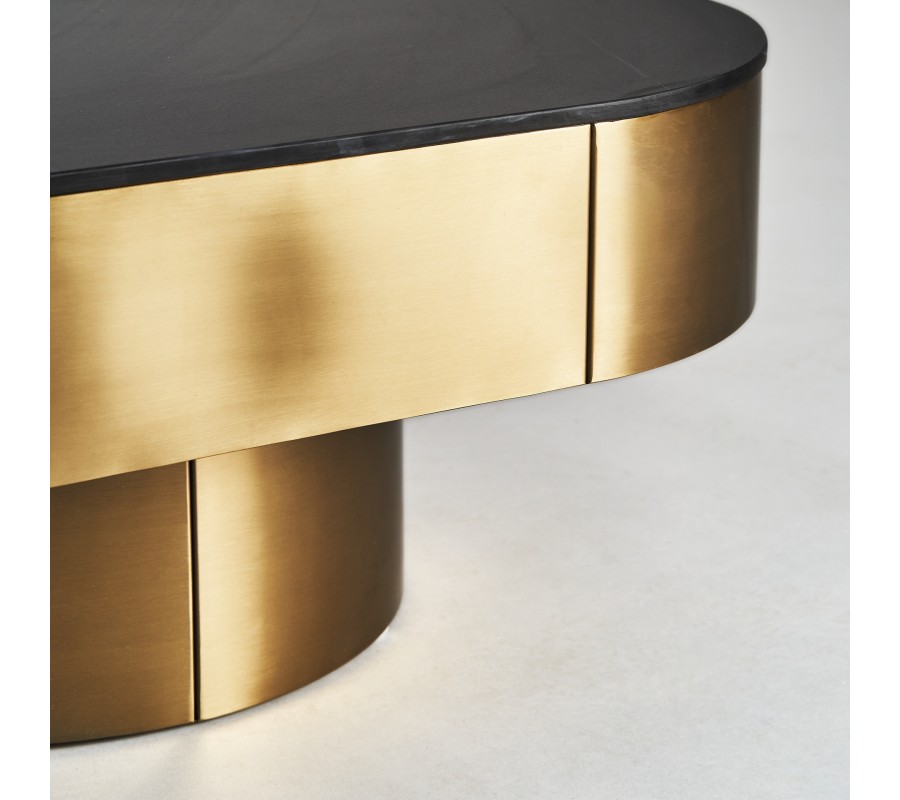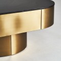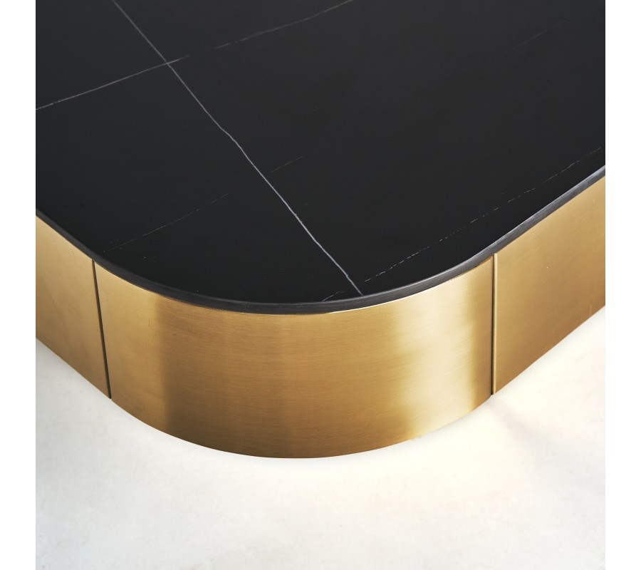 Štvorcový konferenčný stolík Jackson prinesie do vašej obývačky luxus a lesk art deco éry. V siluete prevládajú elegantné krivky, počnúc hrubou okrúhlou nohou, až po zaoblené rohy vrchnej dosky. Tá je vyrobená zo syntetického mramoru, ktorý je veľmi obľúbeným materiálom u dizajnérov nábytku, pretože si zachováva tvrdosť a odolnosť ako prírodný kameň, no pri výrobe je možné ovplyvniť jeho estetické vlastnosti podľa potrieb dizajnu. V tomto prípade sú to avantgardné svetlé vzory na čiernom podklade. Kresba korešponduje so zlatou farbou na bočných stranách vrchnej dosky a na podstave. Stolík môžete umiestniť do priestorov zariadených v tmavých odtieňoch, kde vynikne umelecký charakter vrchnej dosky a honosný zlatý akcent. Neutrálna kombinácia vám tiež umožňuje pridať do obývačky farby, napríklad prostredníctvom sedačky s výrazným zamatovým alebo bouclé čalúnením. Priestor oživia aj lesklé metalické dekorácie a ďalšie luxusné materiály, ako napríklad huňatý kožušinový koberec či vankúš.