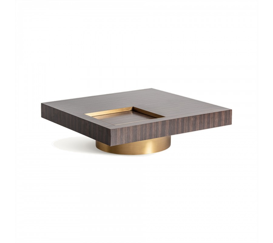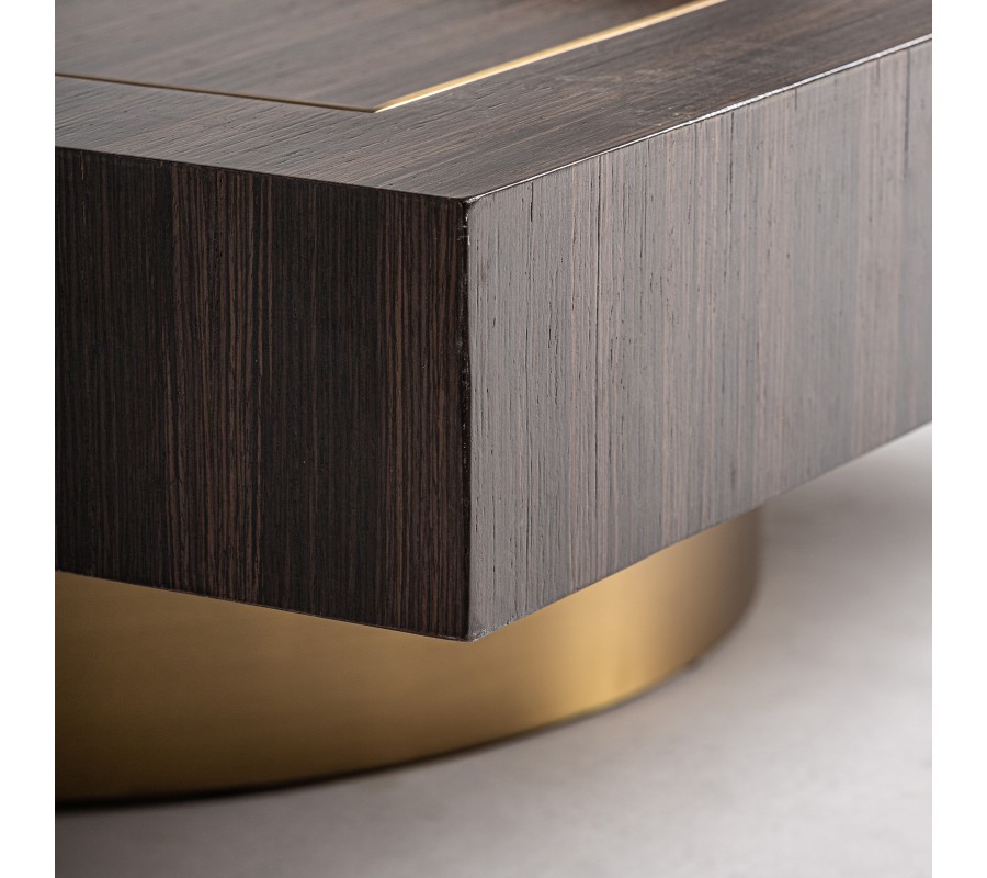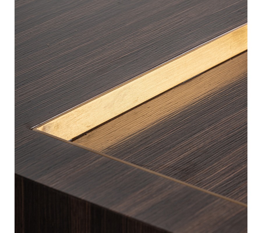 Najvýraznejším prvkom tohto stola je jeho doska v hnedej farbe v štvorcovom tvare s prehĺbením, ktorá nielenže pôsobí esteticky, ale je tiež praktickým doplnkom. Toto prehĺbenie v tvare štvorca poskytuje ideálne miesto na uloženie drobných predmetov, ako sú perá, bloky poznámok alebo dekoračné prvky, a to všetko s štýlom a eleganciou. Jeho okraje zdobené zlatou výstupkou pridávajú tomuto štýlovému prvku ešte viac luxusu a exkluzivity.