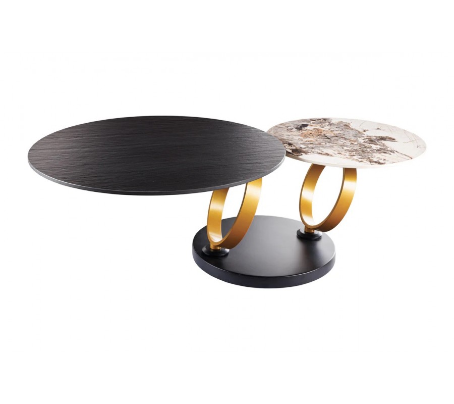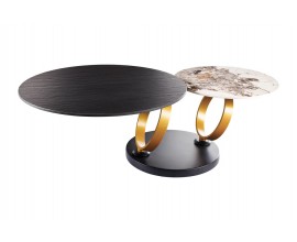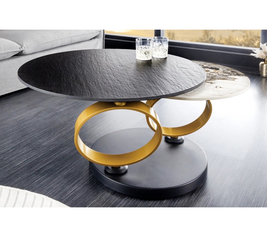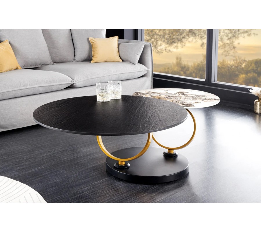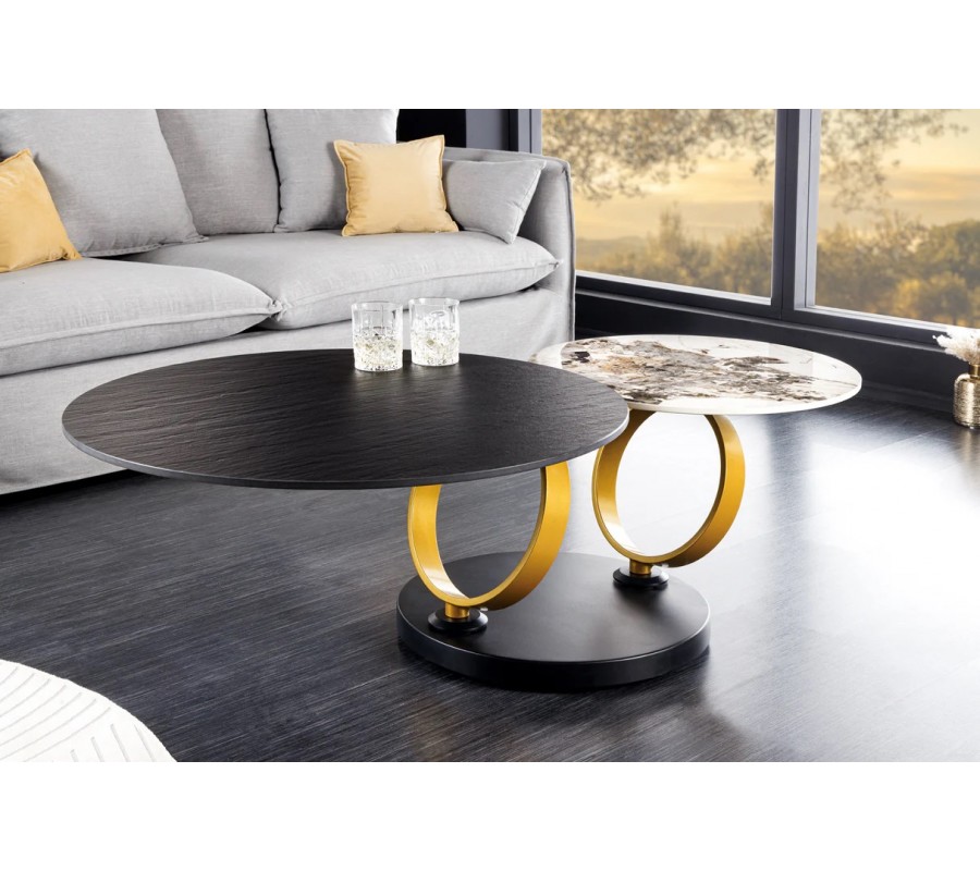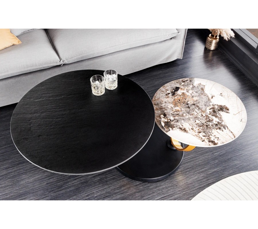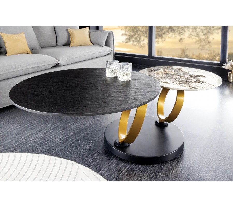 Dizajnový konferenčný stolík s okrúhlymi doskami a zlatými otočnými nožičkami ponúka kombináciu luxusu, elegancie a praktickosti. Jedna z dosiek sa vyznačuje nádherným mramorovým dizajnom, ktorý dodáva stolíku rafinovaný a sofistikovaný vzhľad, zatiaľ čo druhá doska v čiernej farbe pridáva moderný a kontrastný prvok.