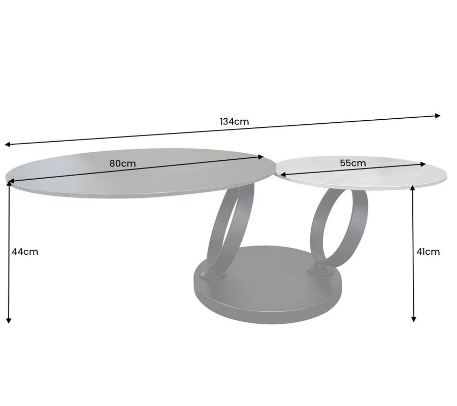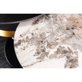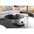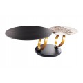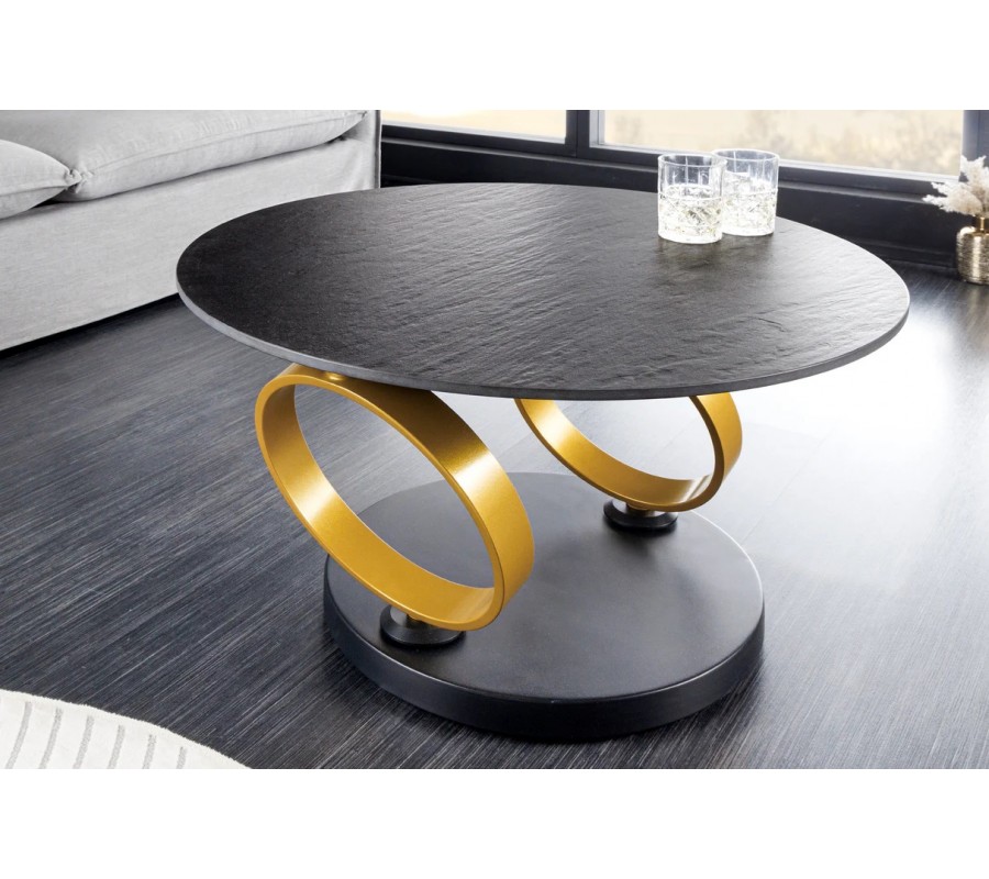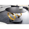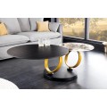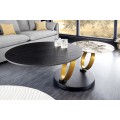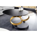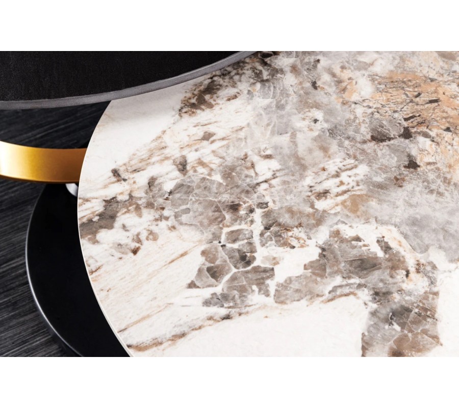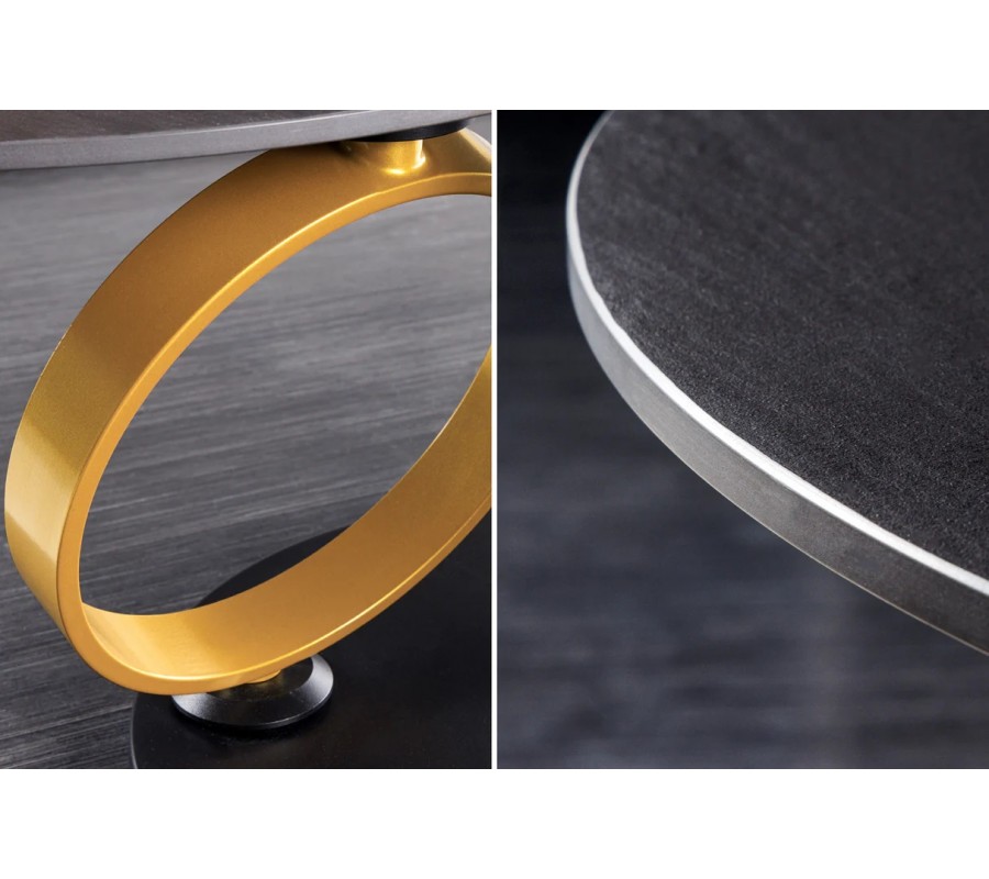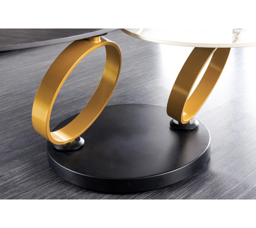 Dizajnový konferenčný stolík s okrúhlymi doskami a zlatými otočnými nožičkami ponúka kombináciu luxusu, elegancie a praktickosti. Jedna z dosiek sa vyznačuje nádherným mramorovým dizajnom, ktorý dodáva stolíku rafinovaný a sofistikovaný vzhľad, zatiaľ čo druhá doska v čiernej farbe pridáva moderný a kontrastný prvok.