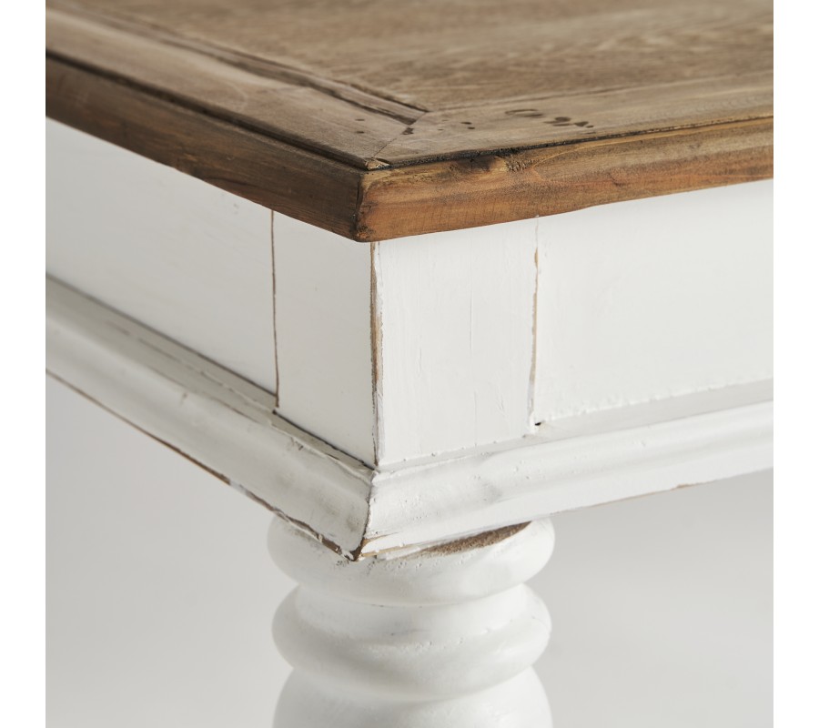 Dizajnu dominuje štvorica vyrezávaných nožičiek, ktorých tvar je inšpirovaný vidieckym nábytkom. V ich siluete dominujú zaoblené tvary, ktoré vytvárajú príjemný kontrast s hranatou vrchnou časťou stolíka. Biely náter je zámerne zošúchaný, čo dodáva nábytku jedinečné čaro vintage štýlu.