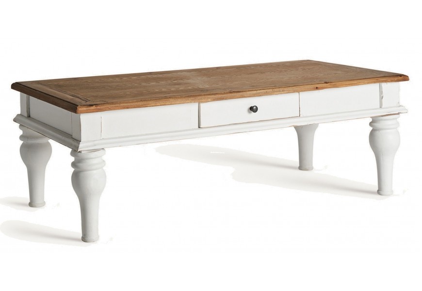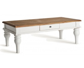 Luxusný biely obdĺžnikový konferenčný stolík Isla v provensálskom štýle s hnedou vrchnou doskou 130 cm