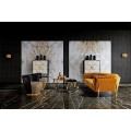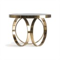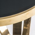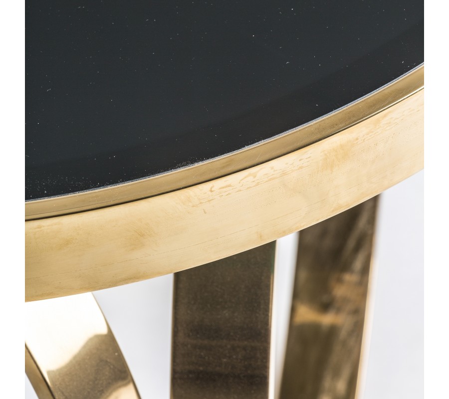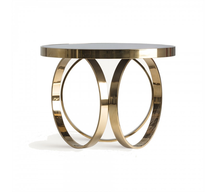 Na prvý pohľad vás očarí jedinečná silueta stolíka, ktorej dominuje motív kruhu. Vrchná doska je vyrobená zo zrkadlového skla v čiernej farbe. Má kovový rám v zlatej farbe a z rovnakého materiálu je zhotovená aj podstava stola v tvare troch na boku postavených obručí. Jednoduché geometrické tvary sa v tomto dizajne spájajú do honosnej kompozície. V kombinácii s výraznými metalickými prvkami a lesklým povrchom reflektuje konferenčný stolík Arossia esenciu štýlu art deco.