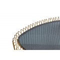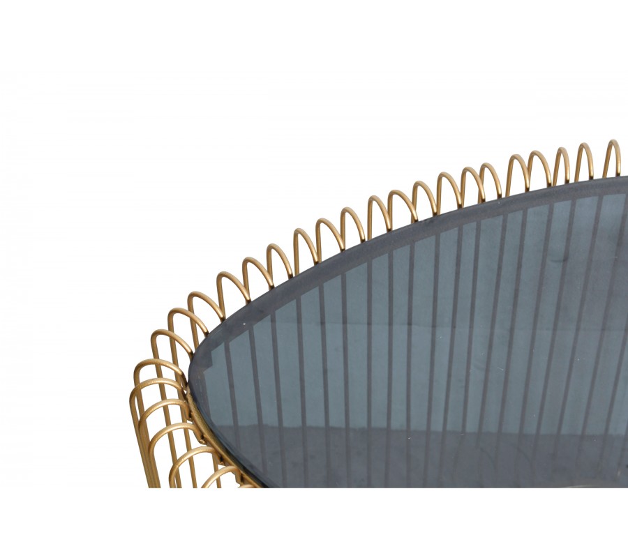 Set konferenčných stolíkov Esme je spojením kvalitných pevných materiálov, ľahkého elegantného dizajnu a flexibilných priestorových možností. Sú inšpirované estetikou art deco štýlu, čo sa odráža v siluete podriadenej geometrickým tvarom a rovným líniám. Na prvý pohľad vás očarí podstava v zlatej farbe. Po dvoch stranách trojuholníkovej vrchnej dosky prečnievajú zakrivené konce štíhlych kovových tyčí, ktoré klesajú v rovných líniách smerom nadol. Ich spodne zakrivené okraje tvoria nožičky stolíka a sú prepojené spojnicou v tvare V, ktorá zaručuje výbornú stabilitu nábytku. Otvorená tretia strana umožňuje zasunúť menší stolík s výškou 43 cm pod väčší stolík s výškou 50 cm, čím dosiahnete štýlový poschodový vzhľad. Vďaka tejto funkcii je set konferenčných stolíkov Esme skvelou voľbou aj do menších obývacích priestorov, v ktorých príležitostne potrebujete väčšiu úžitkovú plochu. Vrchná doska je vyrobená z tmavého bezpečnostného skla. Tento materiál vzniká kalením klasického skla, pri čom sa zmení jeho vnútorná štruktúra a nadobudne tak maximálnu odolnosť. Jeho tmavá čierna farba vytvára príjemný estetický kontrast so žiarivo zlatou podstavou. Priehľadná vrchná doska a vzdušný klietkový dizajn priestor vizuálne nezaťažia a zakrivené prvky dodávajú stolíku delikátny a sofistikovaný vzhľad. Skvele doplní kreslo či sedačku v art deco štýle s lesklými zlatými nožičkami. Môžete zvoliť čalúnenie v jemných neutrálnych odtieňoch, alebo výrazný farebný zamatový či buklé poťah. Touto kombináciou zvýrazníte art deco charakter nábytku a vašej obývačke zároveň dodáte nádych luxusu a honosnosti.
