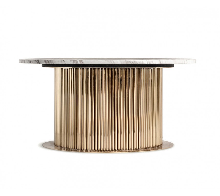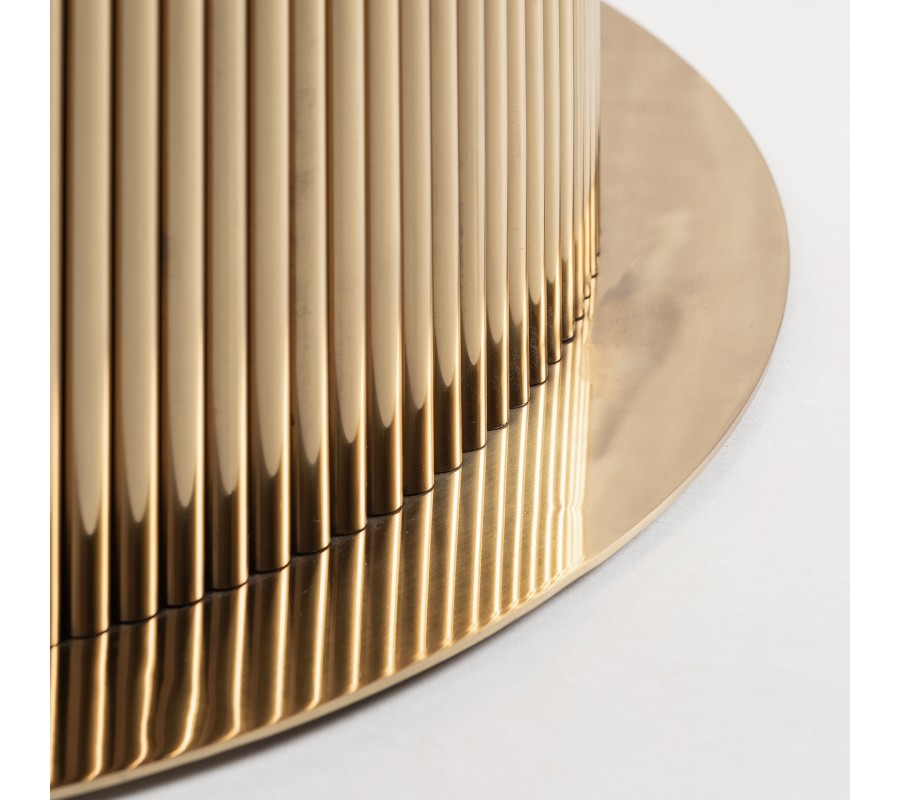 Hlavnú úlohu v dizajne hrajú štruktúry a povrchy. Na prvý pohľad vás uchváti kovová noha stola, ktorá je po obvode zdobená reliéfom tvoreným štíhlymi valcovitými vertikálnymi líniami. Tento drážkovaný dizajn pôsobí v kombinácii s metalickou zlatou farbou opulentným dojmom, typickým pre nábytok v art deco štýle. V spodnej časti je noha podložená hladkou okrúhlou podstavou v rovnakej farbe, ktorá zaručuje výbornú stabilitu nábytku.