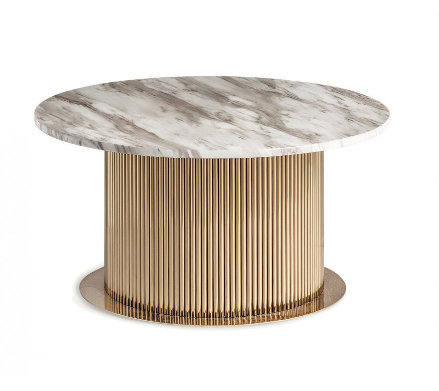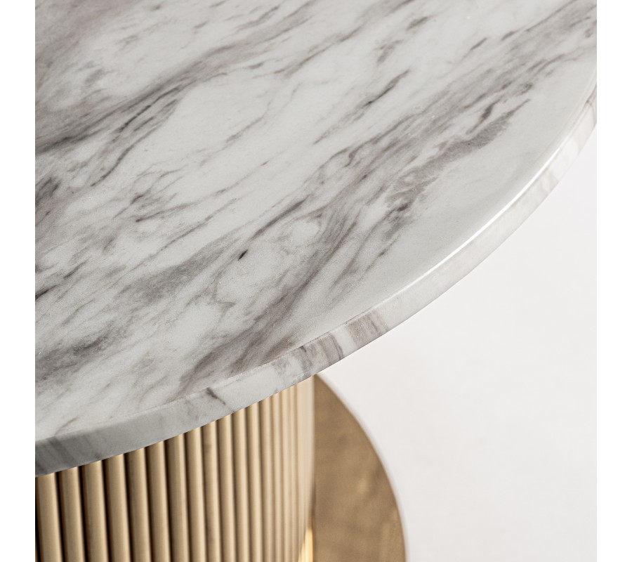 Luxusný okrúhly art deco konferenčný stolík Pius s bielou mramorovou doskou a zlatou nohou s drážkovaným dizajnom 80 cm