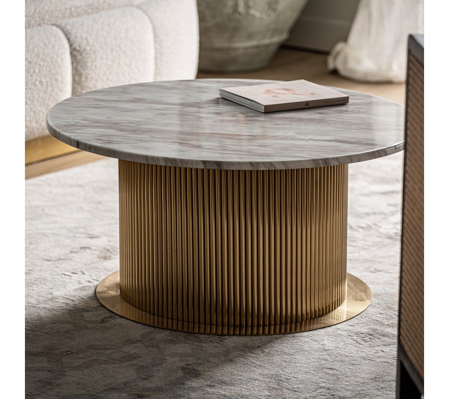 Luxusný okrúhly konferenčný stolík Pius prinesie do vašej obývačky honosný luxus. Kombinácia mramorového dizajnu so zlatou farbou pôsobí exkluzívny dojmom a je ideálnou voľbou do priestorov v štýle art-deco či glamour.