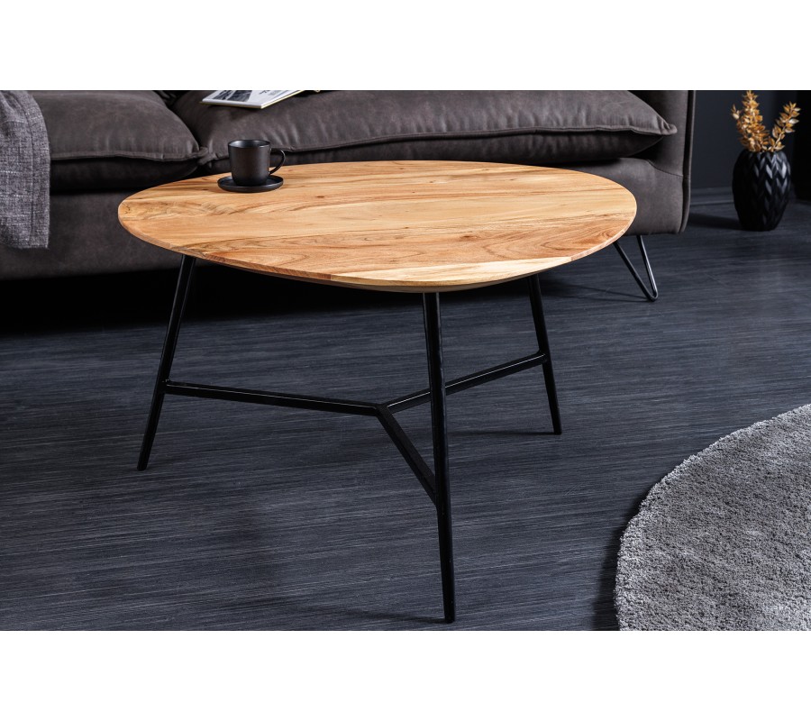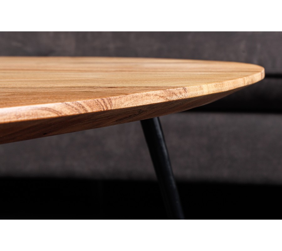 Vrchná doska z akáciového dreva má hladký rovný povrch, ktorý zdobí prirodzená kresba letokruhov. Príjemný svetlý hnedý odtieň pôsobí teplým dojmom a kompenzuje tak chladný kovový charakter spodnej časti stola. Akáciové drevo je taktiež veľmi tvrdé a nábytok z neho je mimoriadne trvácny.