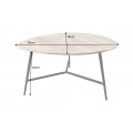 Silueta stolíka je moderná a prevládajú v nej základné tvary. Vrchná doska je trojuholníková, so zaoblenými rohmi a hranami. Je uložená na troch nožičkách štíhleho valcovitého tvaru. Prepája ich spojnica v tvare trojramennej hviezdy. Podstava je vyrobená z kovu s čiernym matným nástrekom, ktorý prináša do kompozície jemný industriálny nádych.