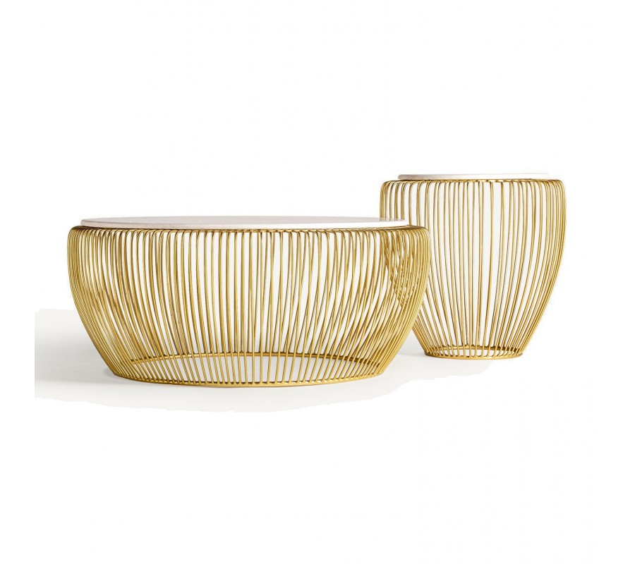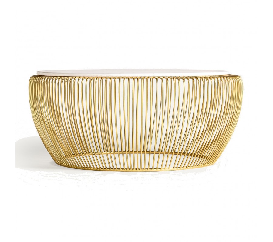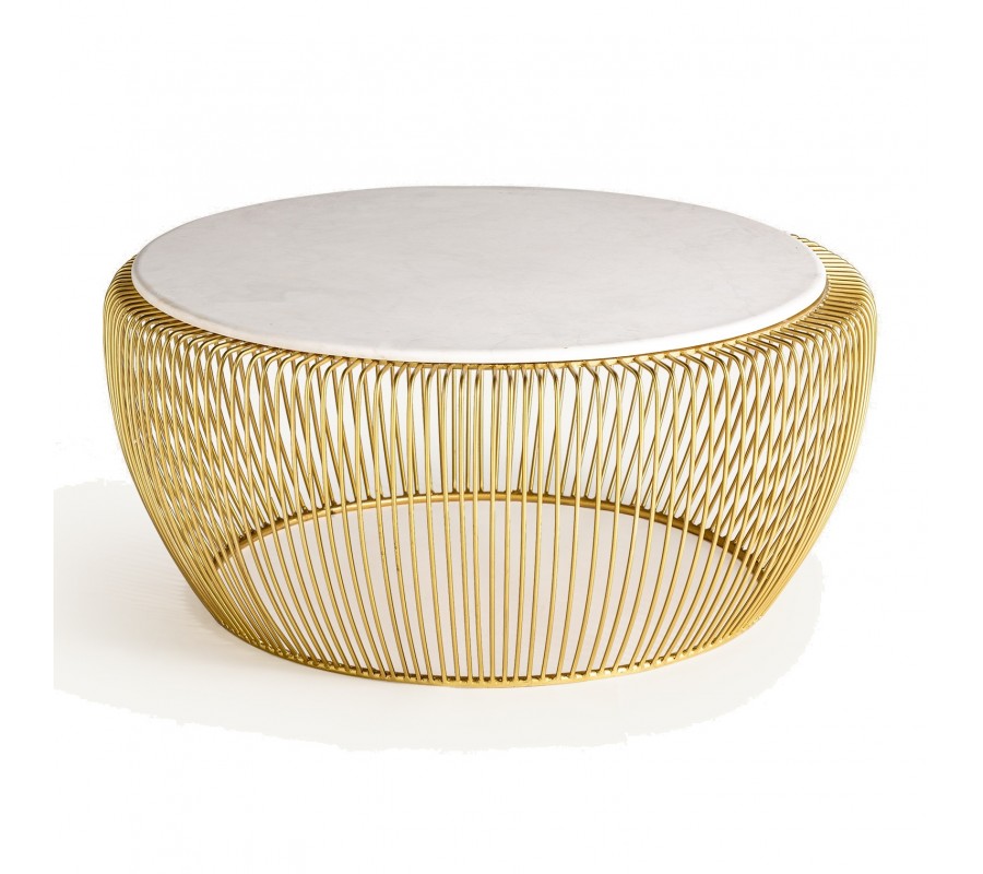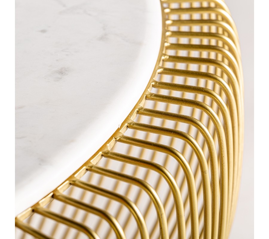 Silueta nábytku pripomína košík. Vrchná doska má okrúhly tvar a je zhotovená z mramoru. Na bielom podklade sa odvíja jemná prírodná kresba kameňa v svetlých sivých odtieňoch. Tento materiál pôsobí exkluzívnym dojmom a skvele dopĺňa lesklú kovovú podstavu v zlatej farbe.