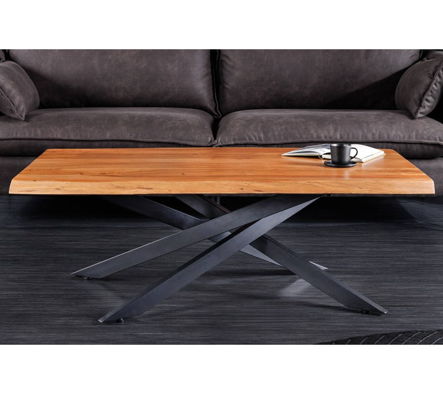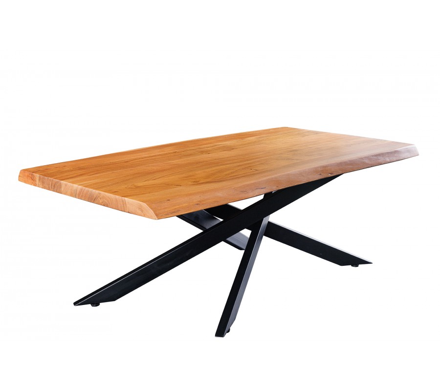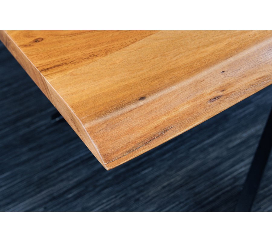 Vrchná doska je zhotovená z pevného akáciového dreva. Dizajn rešpektuje jeho prirodzené štruktúry, ktoré sledujú aj nerovné dlhšie hrany dosky. Tento prírodný prvok vytvára príjemný kontrast s industriálne pôsobiacou podstavou stola. Na hladkom povrchu vyniká kresba letokruhov v teplých odtieňoch hnedej, so žltým podtónom.
