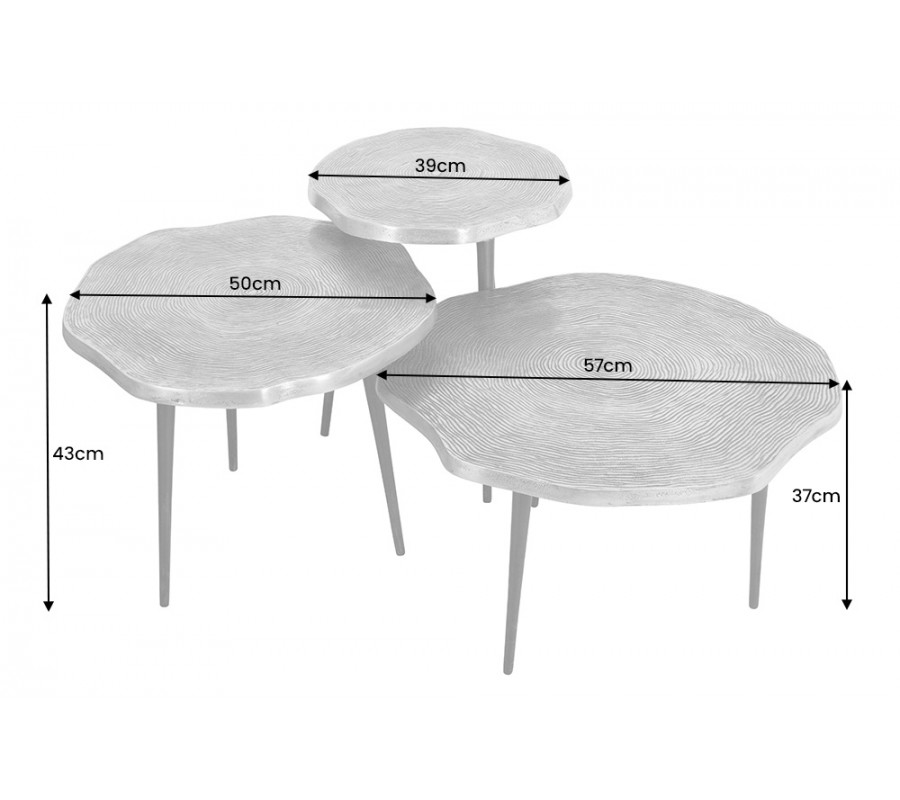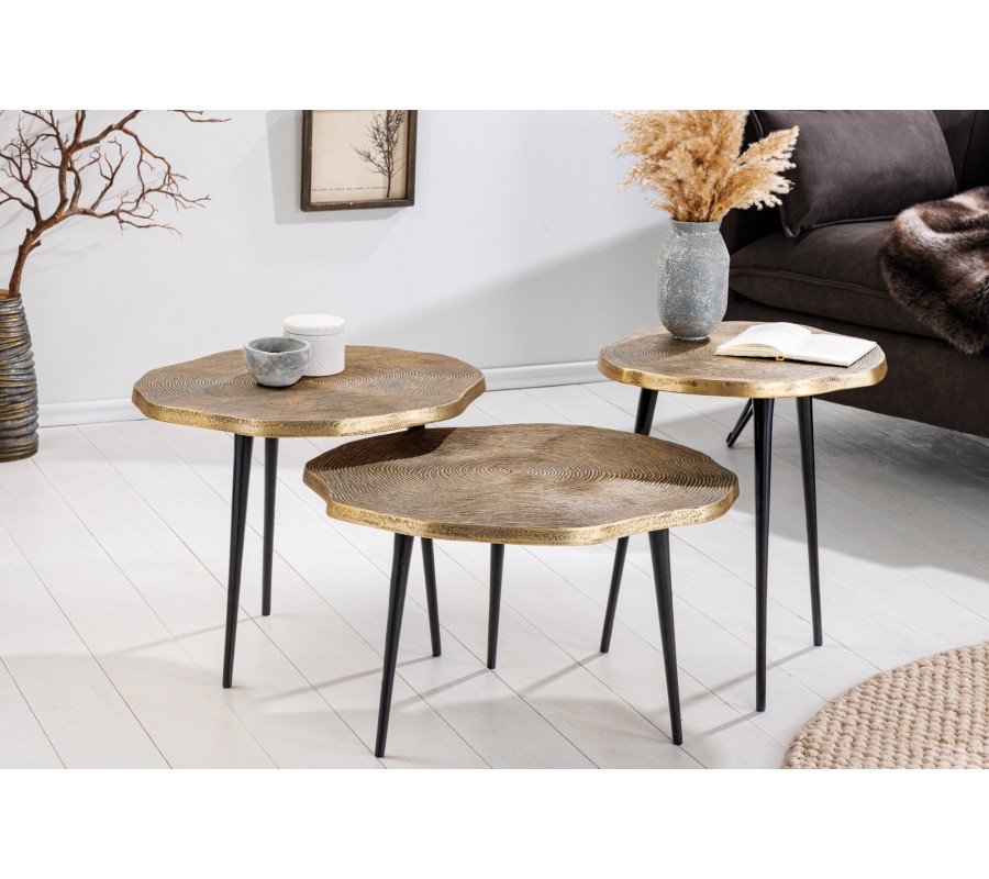 Sada konferenčných stolíkov Fabiosa v sebe spája luxus art deco štýlu a dizajn inšpirovaný prírodou. Tri stolíky s výškou 49 cm, 43 cm a 37 cm môžete umiestniť každý zvlášť, ako príručné stolíky, alebo spoločne k sedačke, čím vytvoríte originálny centrálny prvok vašej obývačky.