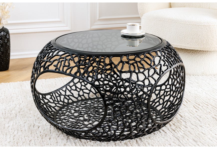 Vo vrchnej časti sa nachádza okrúhla vrchná doska s priemerom 49 cm z bezpečnostného skla. Je polopriehľadná a má čiernu farbu, ktorá skvele dopĺňa podstavu. Napriek ľahkému a vzdušnému vzhľadu sa však nemusíte báť krehkosti nábytku. Podstava je zhotovená zo zliatiny kovu a bezpečnostné sklo je veľmi pevné a odolné.