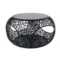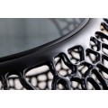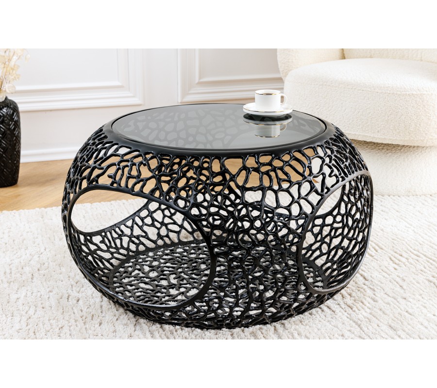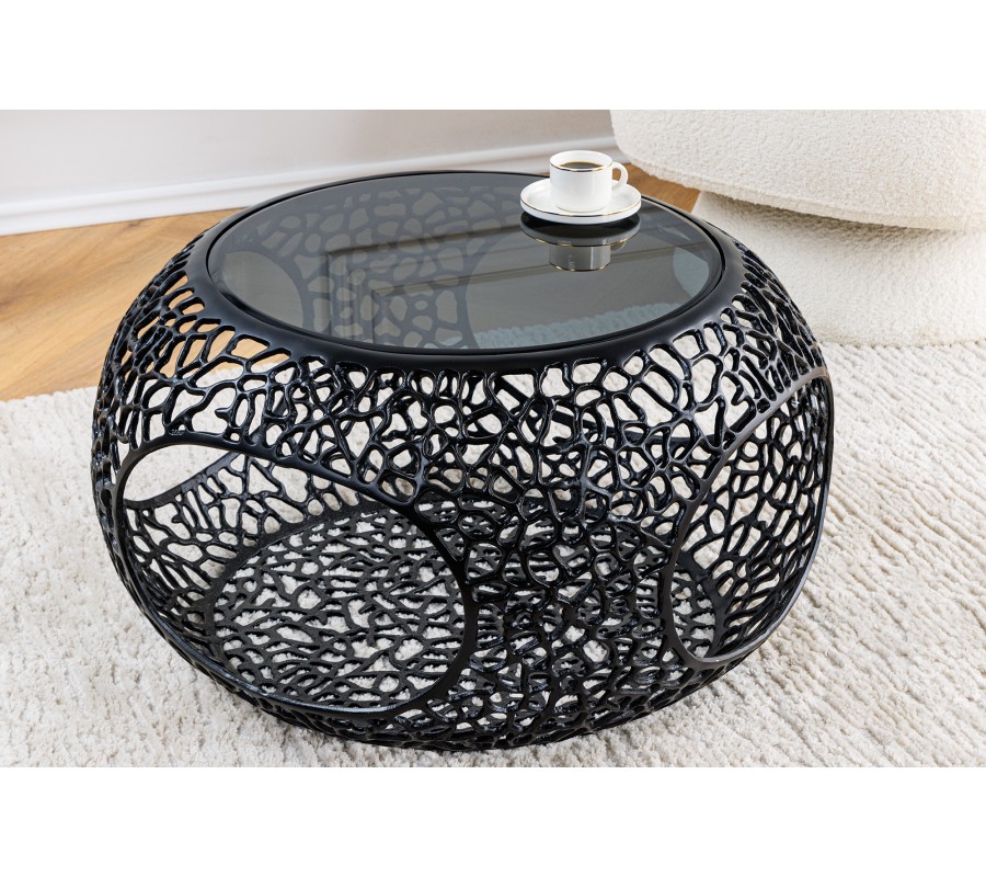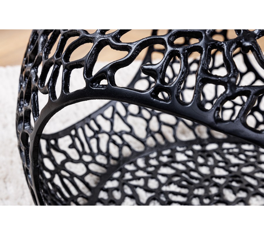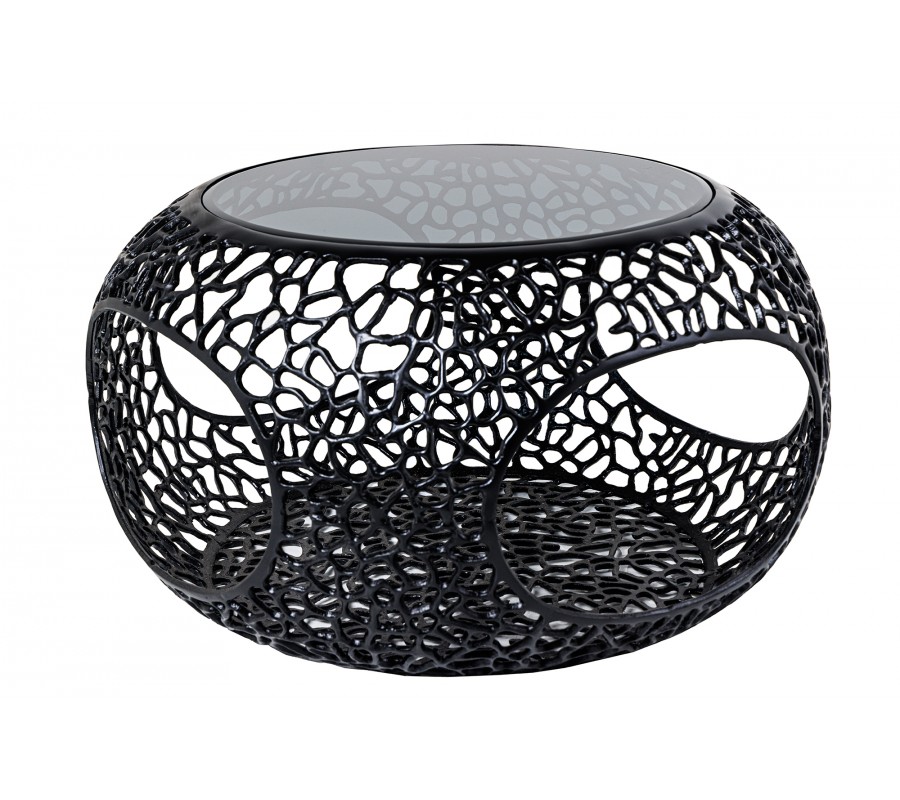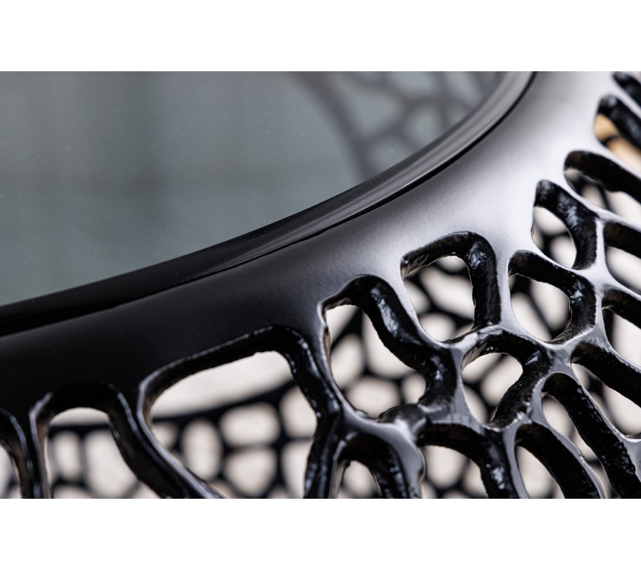Stolík má tvar gule so zrezanou vrchnou a spodnou časťou. Čierna podstava tento tvar sleduje a vo svojom strede vám poskytuje bohaté množstvo úložného priestoru. Po obvode stolíka a v jeho spodnej časti je zo zliatiny kovu vytvorený abstraktný nepravidelný vzor pripomínajúci bunkovú štruktúru listov. Na podstave sa tiež nachádzajú štyri kruhové výrezy, ktoré sprístupňujú úložný priestor.
