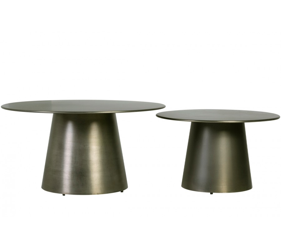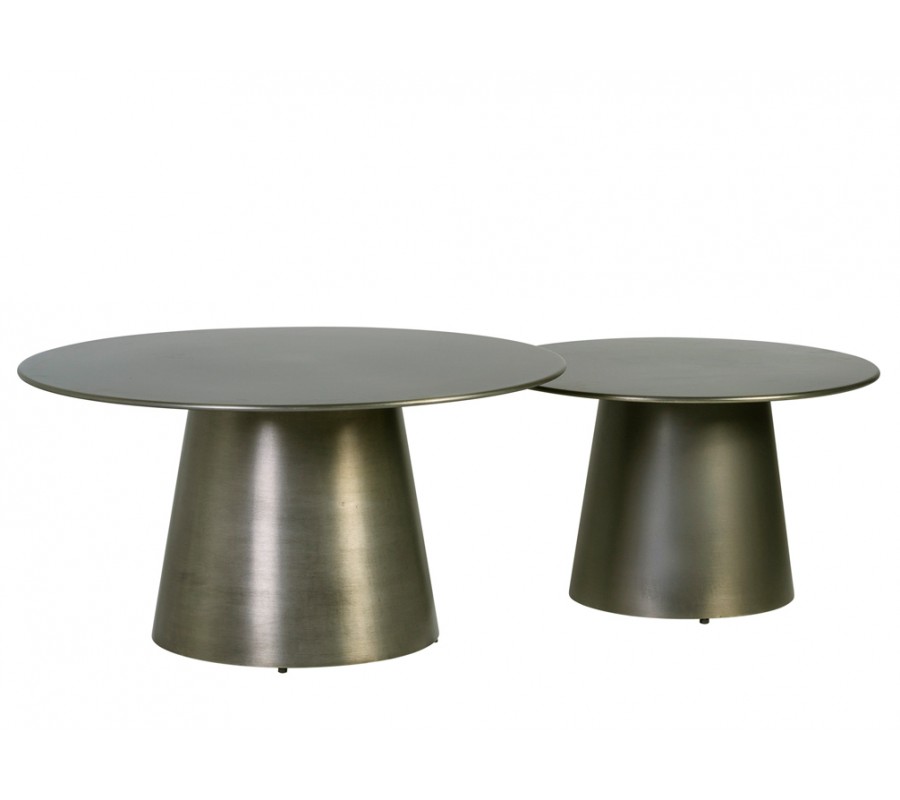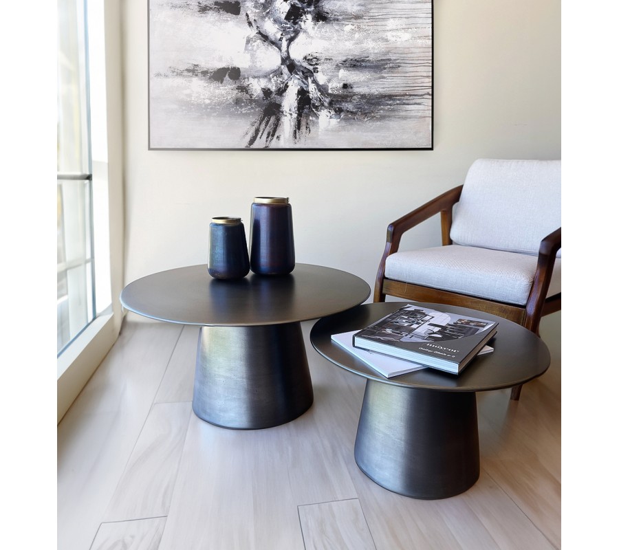 Štýlový ste konferenčných stolíkov v art deco štýle je unikátna dvojica kúskov s osviežujúcim minimalistickým základom s jemnými líniami. Stolíky sú vyrobené z kovu s matným sivým a hladkým povrchom. Okrúhla vrchná doska je tenká ale pevná, ktorá dodáva stolíku ľahkosť. Noha je valcového tvaru pričom na jej spodu sa mierne rozširuje.