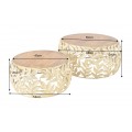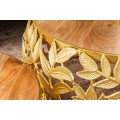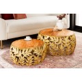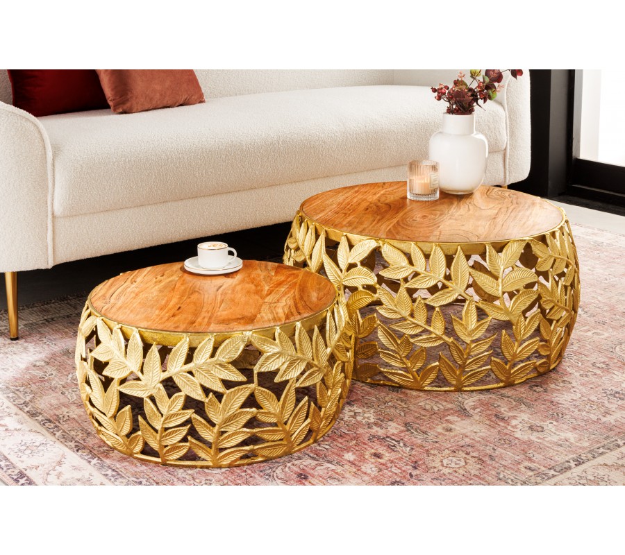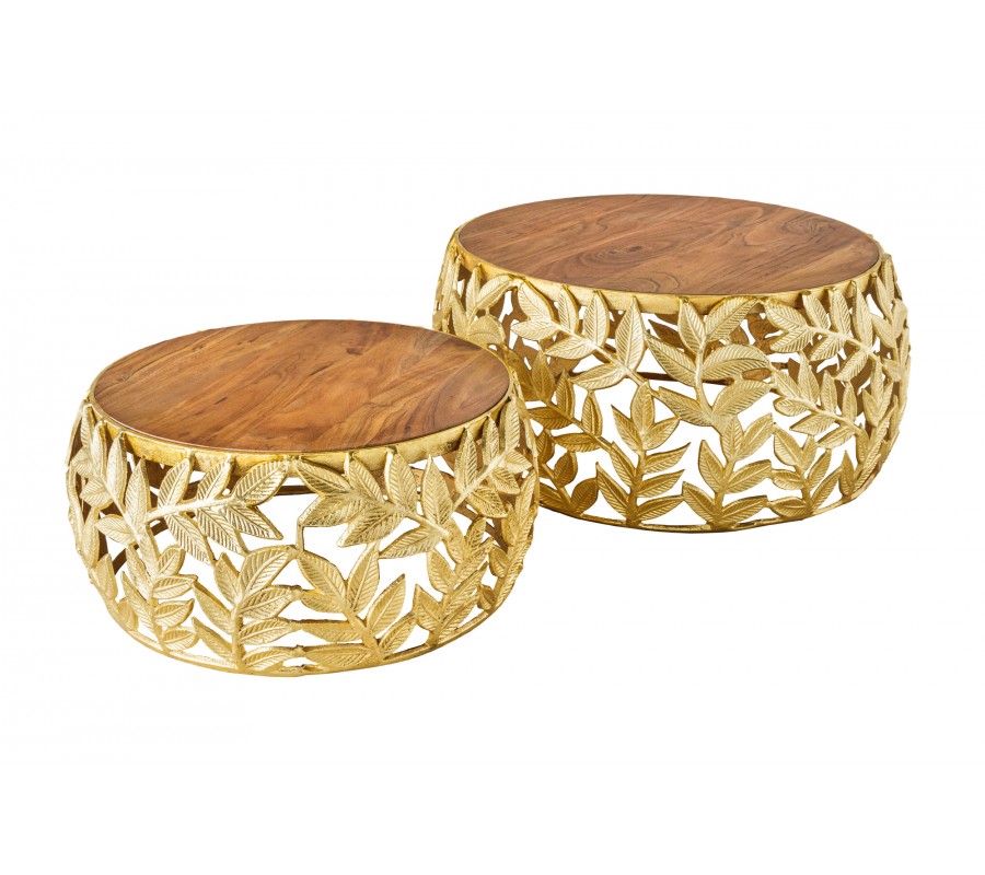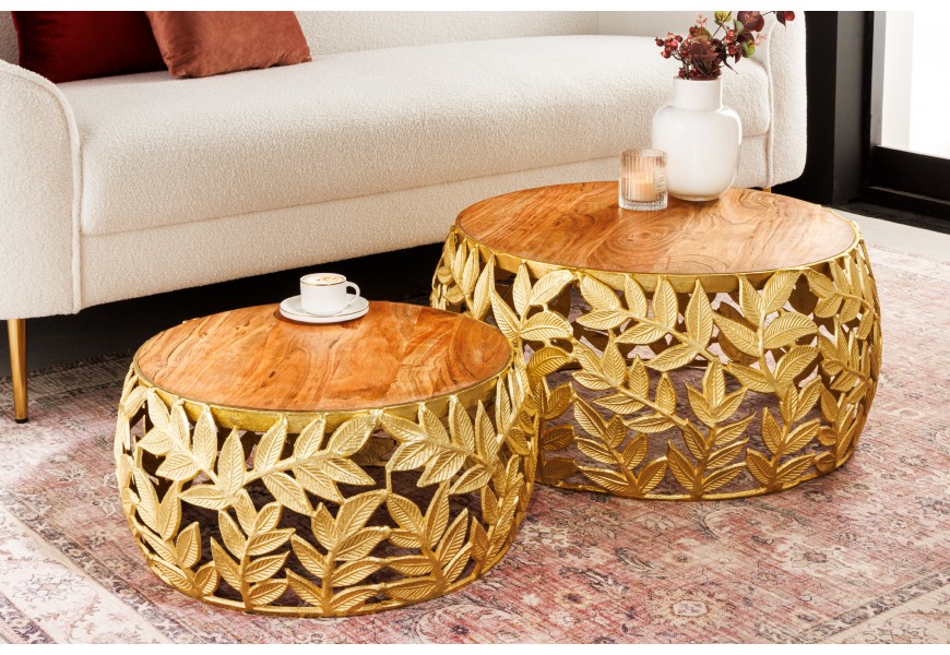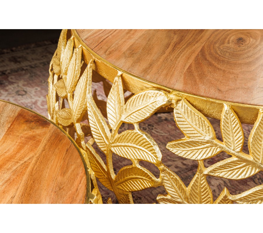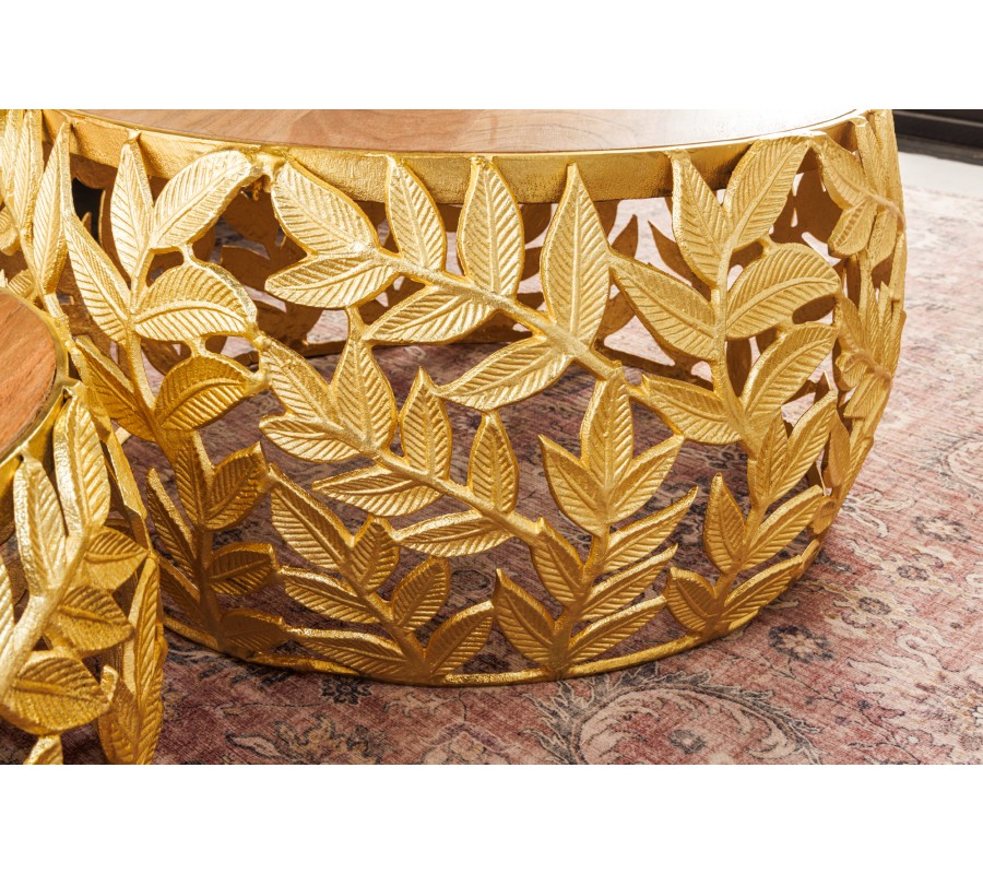Zlatá glamour sada dvoch okrúhlych konferenčných stolíkov Basoa s podstavou s dizajnom listov a drevenou doskou 68 cm