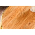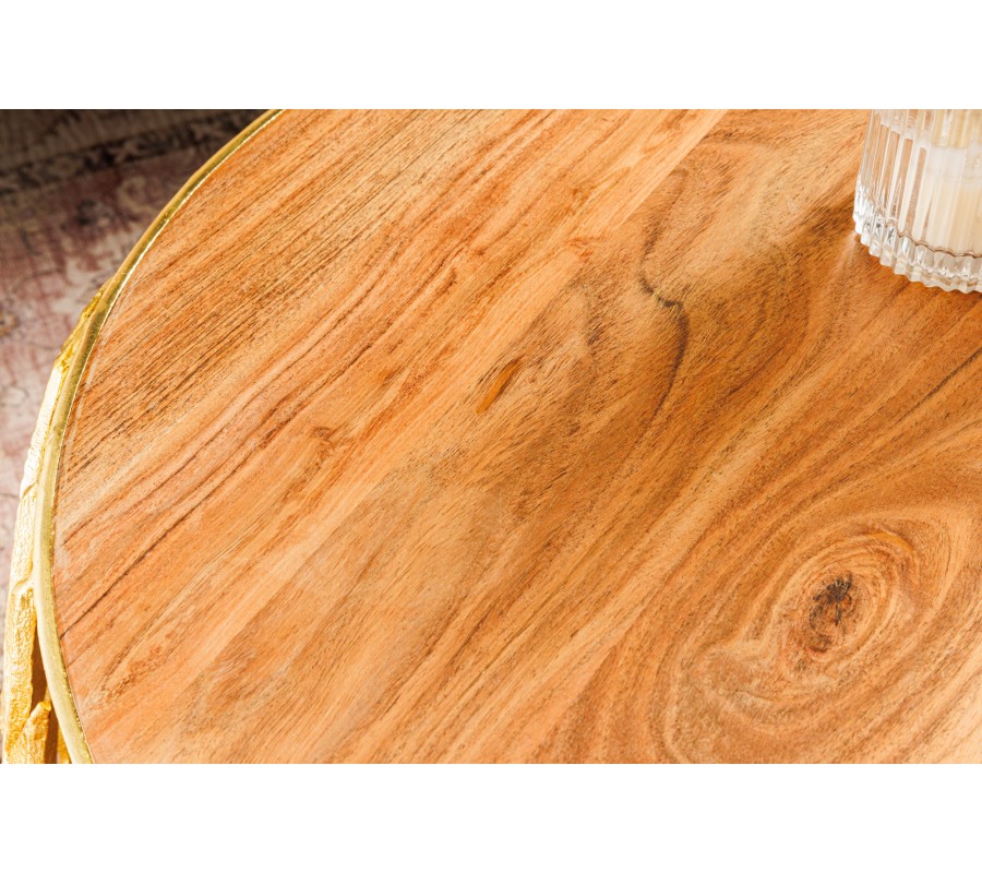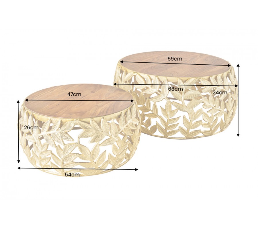 Sada pozostáva z dvoch stolíkov, väčší má výšku 35 cm a priemer 68 cm a menší výšku 26 cm a priemer 54 cm. Okrúhle vrchné dosky sú vyrobené z akáciového dreva, ktoré je veľmi tvrdé a odolné. Má príjemnú medovo hnedú farbu s charakteristickou výraznou kresbou letokruhov. Jeho teplý odtieň skvele dopĺňa metalickú zlatú farbu.
