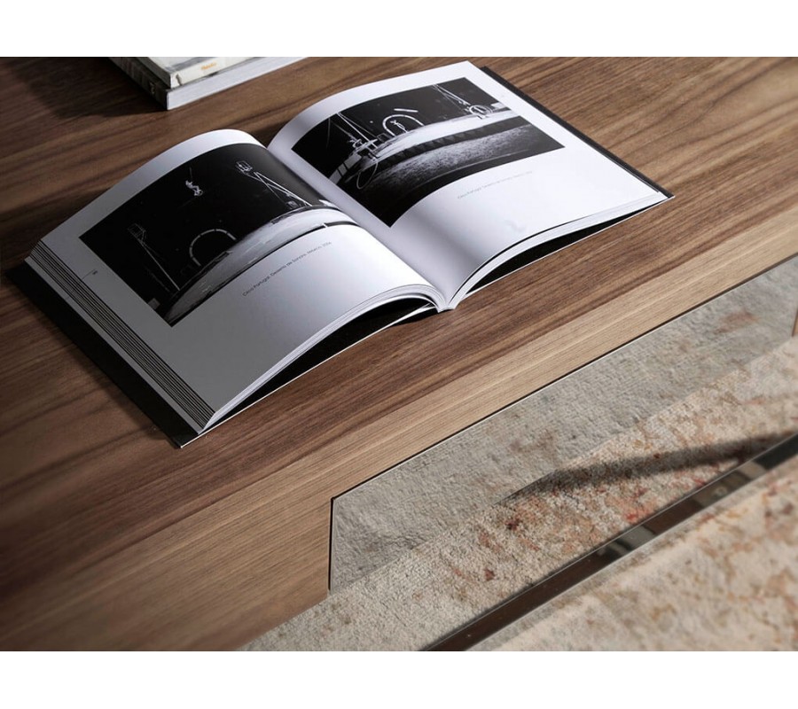 Stolík má minimalistickú siluetu, v ktorej dominujú hladké povrchy, rovné línie a pravé uhly. Vrchná doska má obdĺžnikový tvar, s výškou 15 cm. Je vyrobená z kvalitnej orechovej dyhy v bohatom odtieni hnedej s jemnou kresbou letokruhov. Štruktúra dreva má lineárnu tendenciu a plynie vždy paralelne s dlhšími hranami nábytku. Tento vzor podčiarkuje čistý moderný dizajn a zároveň prinesú do priestoru pocit tepla a útulnosti.