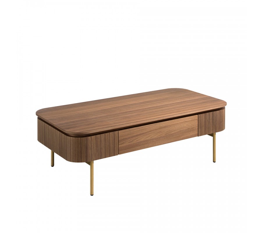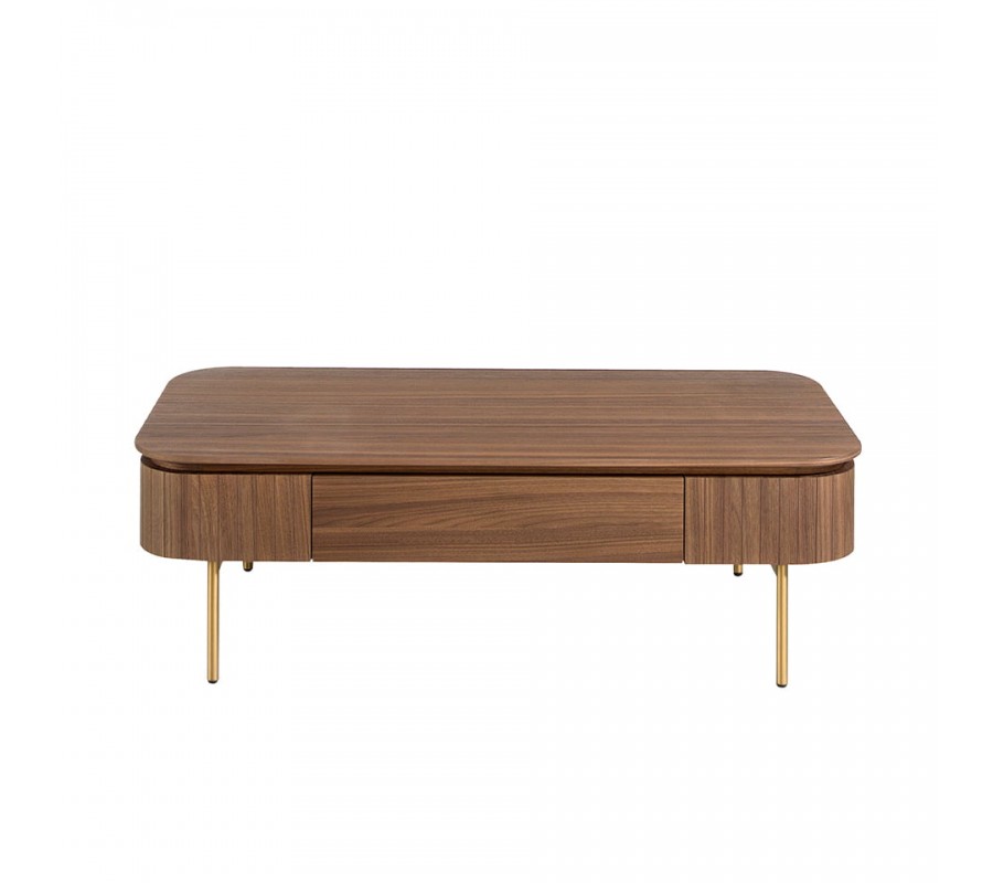 Luxusný art deco obdĺžnikový konferenčný stolík Vita Naturale z hnedého orechového dreva so zásuvkou a zlatými nožičkami 120 cm