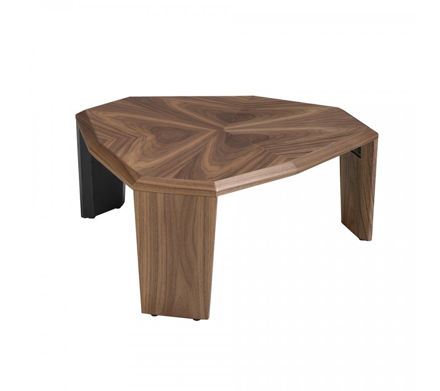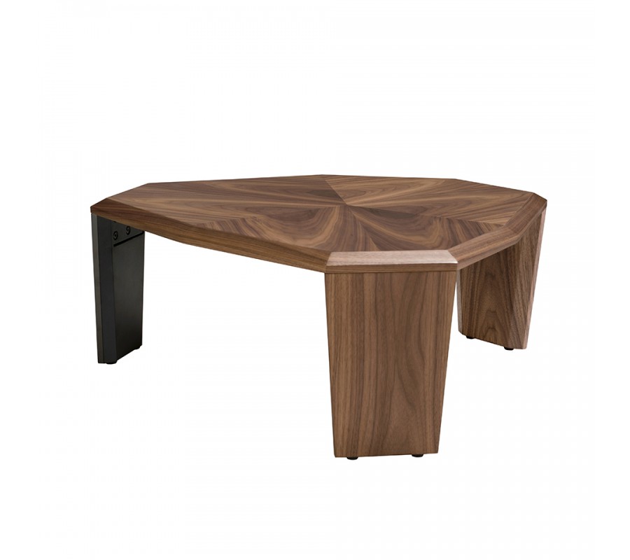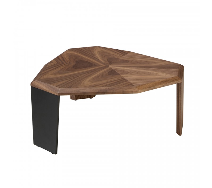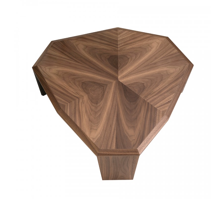 Vrchná doska stolíka má trojuholníkový tvar, so zalomenými rohmi. Tie sa cez diagonálne zrezanú hranu prelievajú smerom dole a vytvárajú trojicu plochých nožičiek, s mierne sa zužujúcim tvarom. Táto atypická silueta pôsobí moderným dojmom a jednoduché hladké povrchy podčiarkujú minimalistický charakter dizajnu.