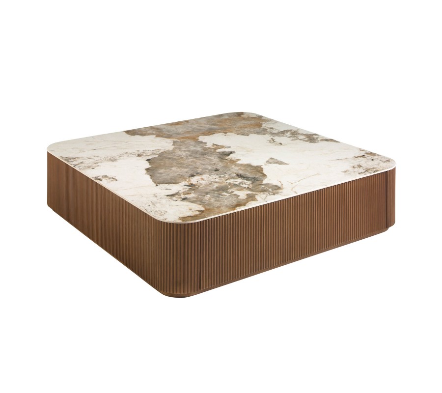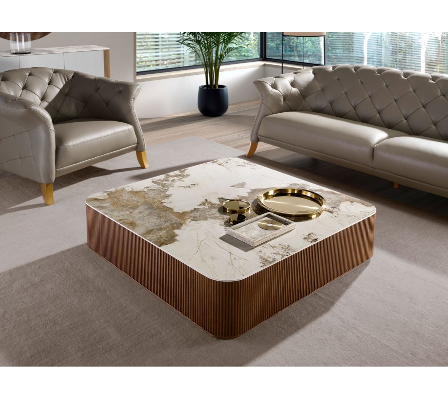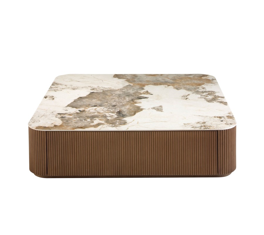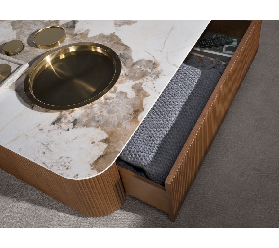 Konferenčný stolík Vita Naturale vás očarí skvostným spojením moderného talianskeho dizajnu s prvkami art deco štýlu. Kombinácia luxusného mramorového povrchu a reliéfneho drážkovaného zdobenia podstavy prinesie do vašej obývačky nádych elegancie a luxusu. Poteší vás aj praktický úložný priestor.