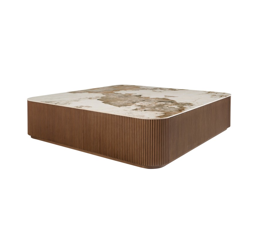 Stolík je vyrobený z dyhovaného dreva v krásnom orechovom hnedom odtieni. Táto farba pôsobí teplým dojmom a skvele sa prepája so zemitými odtieňmi mramorovej kresby. Vrchná doska je vyrobená z porcelánu, ktorý vám poskytuje pevný a ľahko udržiavateľný povrch. Na bielom pozadí sa odvíja kresba kameňa v hnedých a sivých tónoch.