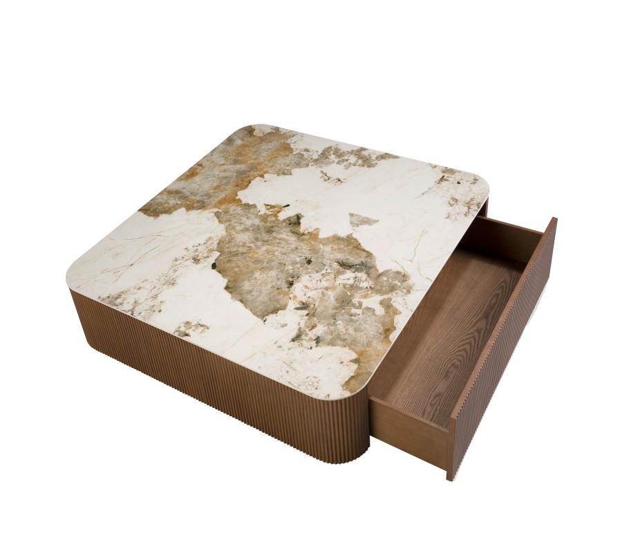 Luxusný art deco hnedý štvorcový konferenčný stolík Vita Naturale so zásuvkou a doskou s bielym mramorovým dizajnom 120 cm