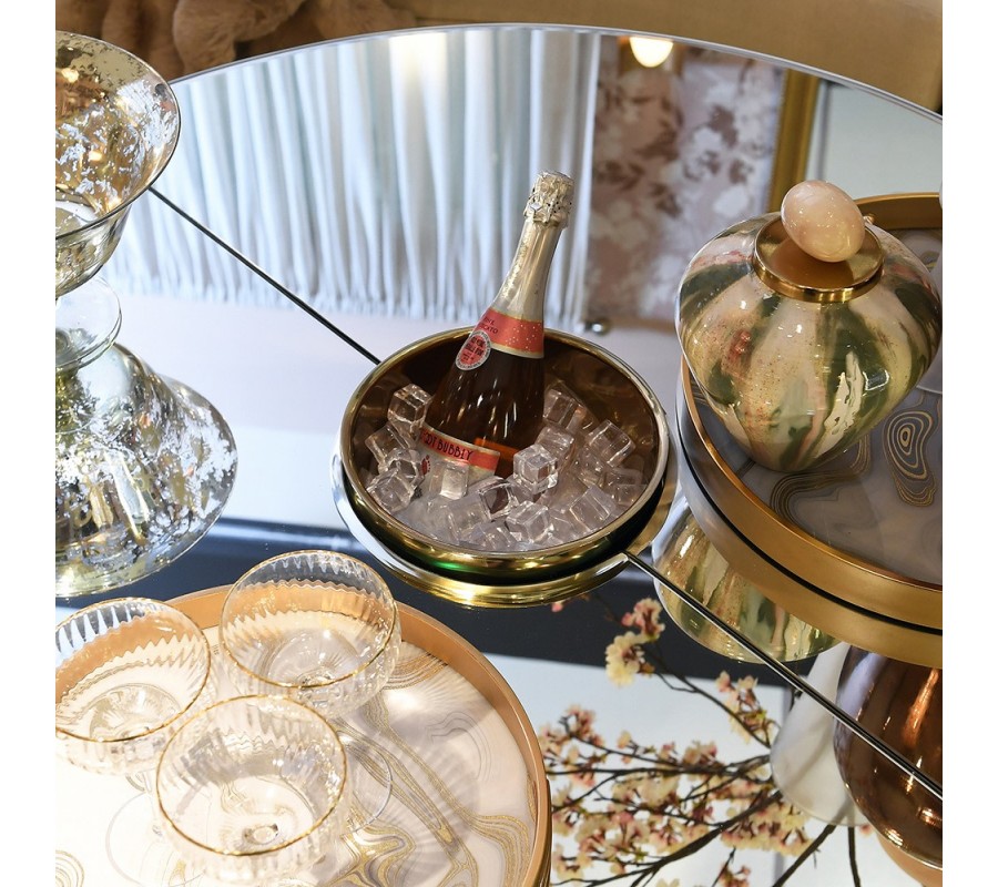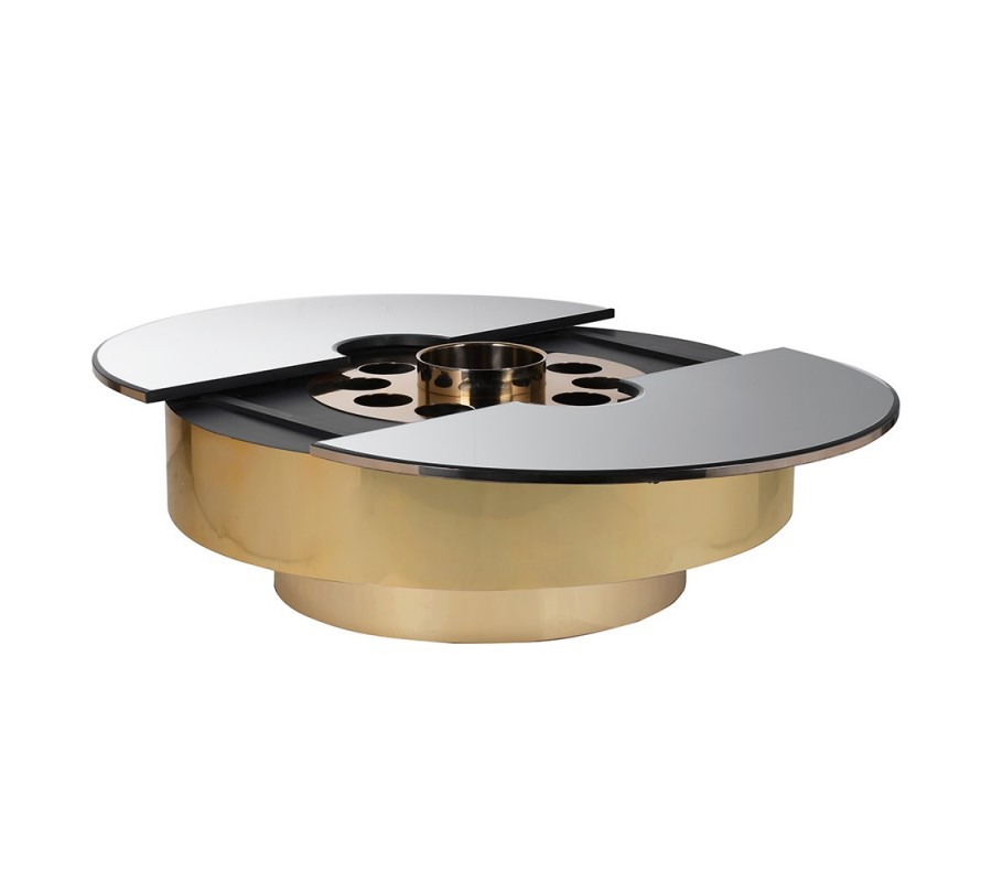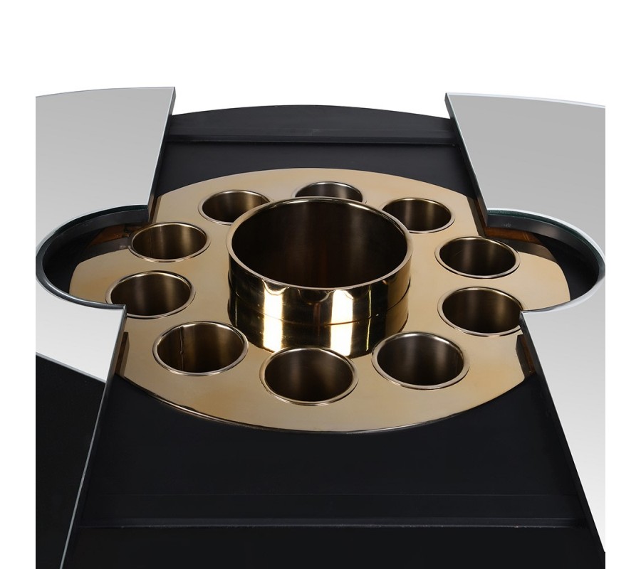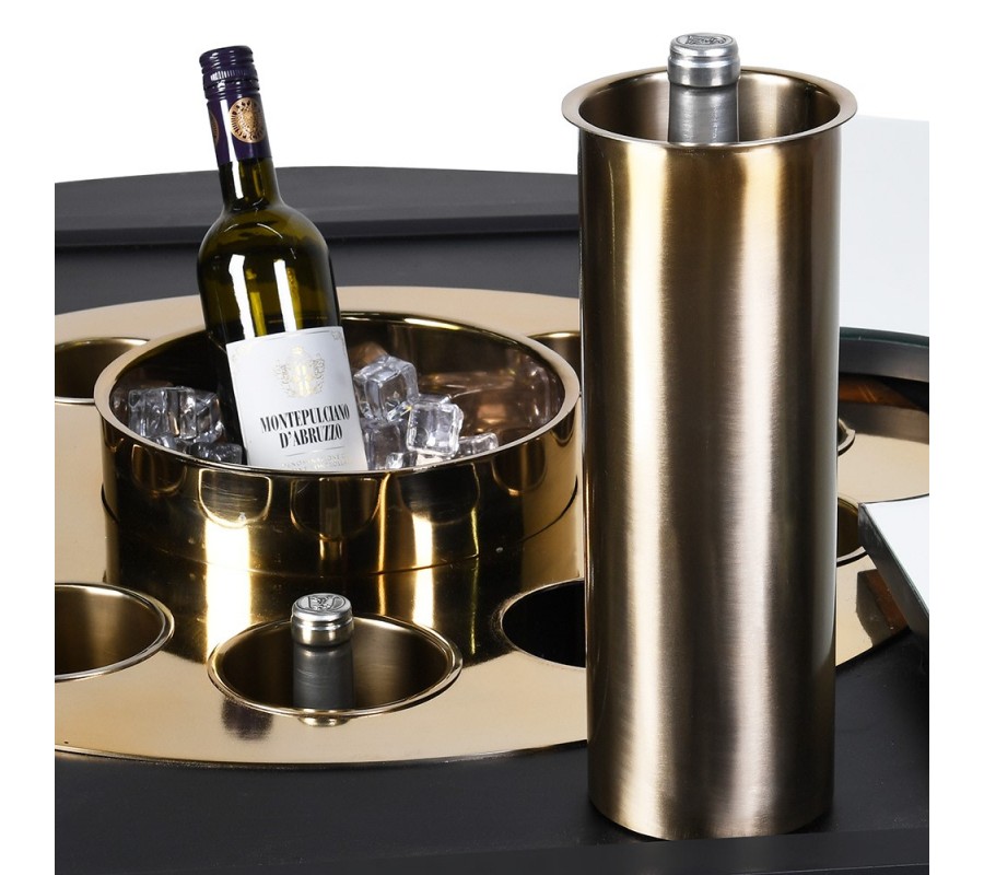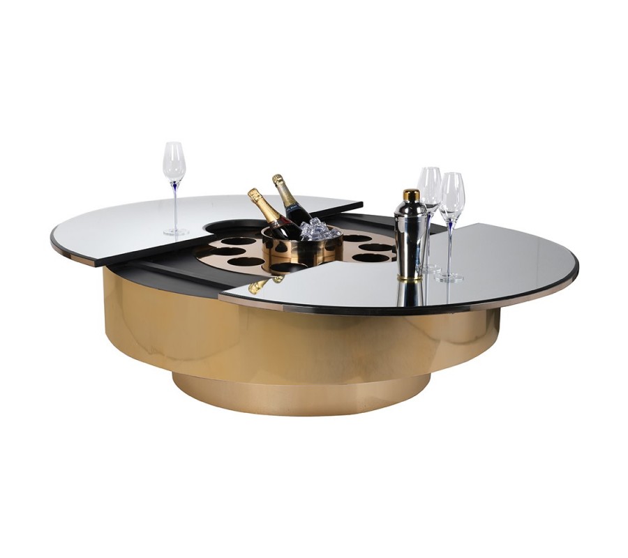 Vrchní část stolku obsahuje otvory na umístění lahví a je vybavena rozkládacím mechanismem, který umožňuje praktické uspořádání nápojů. Zrcadlová deska se dá snadno rozložit, čímž se odhalí centrální prostor pro umístění nádoby na led. Tento promyšlený design nabízí praktičnost, ideální pro společenská setkání a rodinné oslavy.