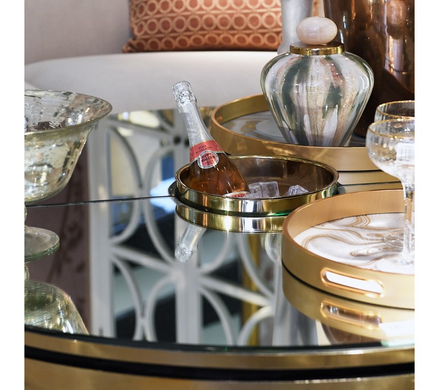 Luxusní konferenční stolek Brilliance ve stylu art deco představuje eleganci. Jeho kulatý tvar a pevná základna z kvalitního kovu se zlatou povrchovou úpravou přidávají prostoru luxus a výrazný lesk. Zlatý povrch základny vytváří efekt, který doslova přitahuje pohledy a hodí se do art deco interiérů díky své nadčasové eleganci a přepychu. Zrcadlová vrchní deska stolku zosobňuje glamour styl a přidává sofistikovaný lesk, který prozáří místnost.