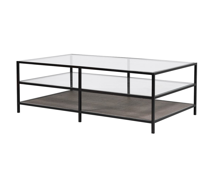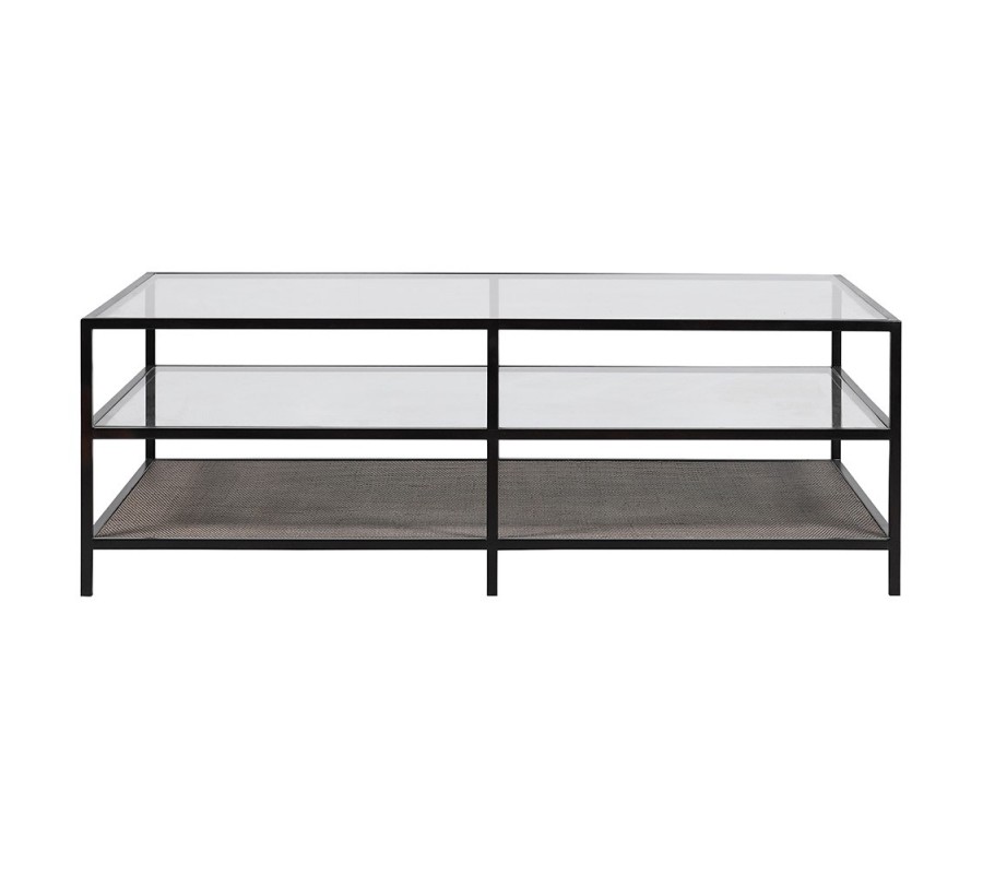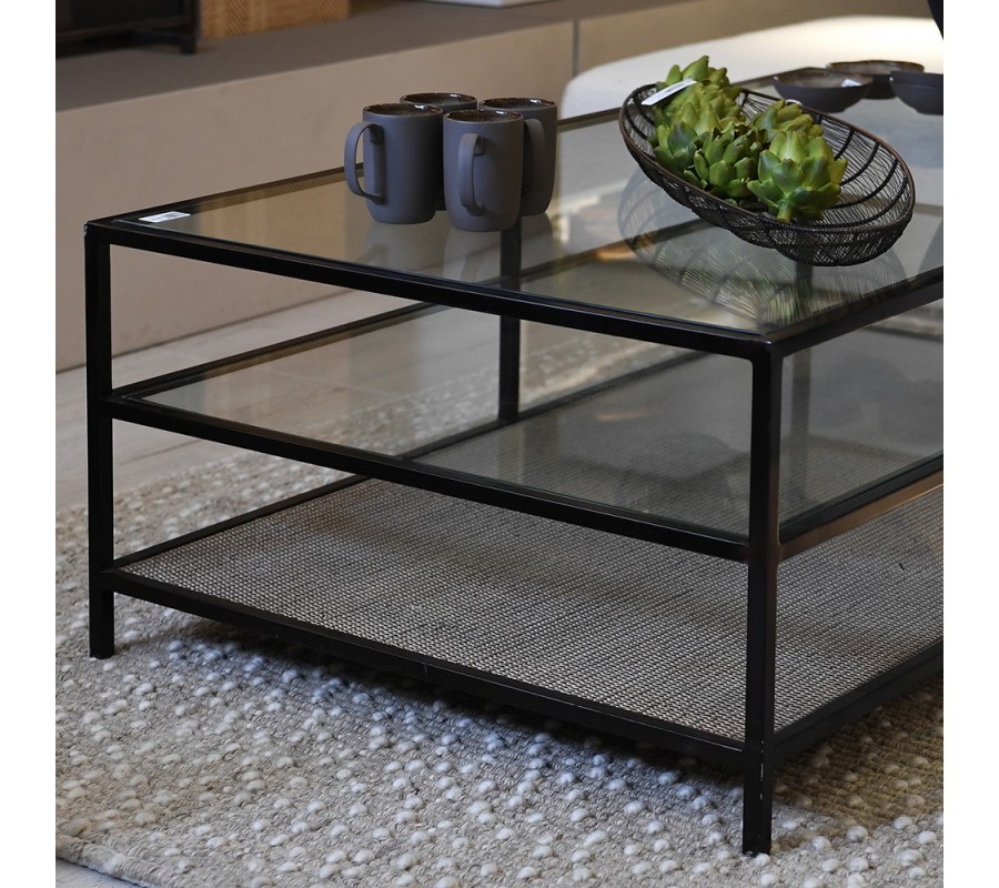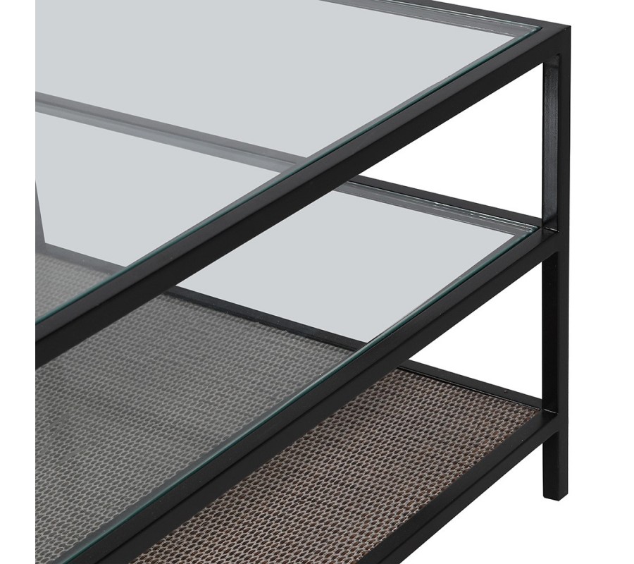 Luxusný industriálny obdĺžnikový čierny konferenčný stolík Basse so sklenou doskou a policou s prírodným výpletom 140 cm