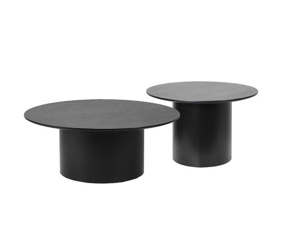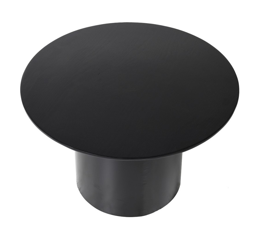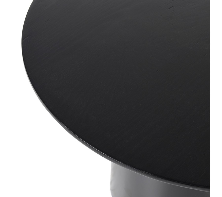 Vrchné dosky sú vyrobené z dyhovaného dubového dreva a matným čiernym lakovaním. Na rovnom povrchu vyniká naturálna kresba letokruhov, ktorá prináša do dizajnu prírodný element v modernom prevedení. Okrúhly tvar výborne dopĺňa hladká valcovitá noha, tiež v matnom čiernom prevedení. Je vyrobená z kovu a prináša do dizajnu nádych industriálneho štýlu.
