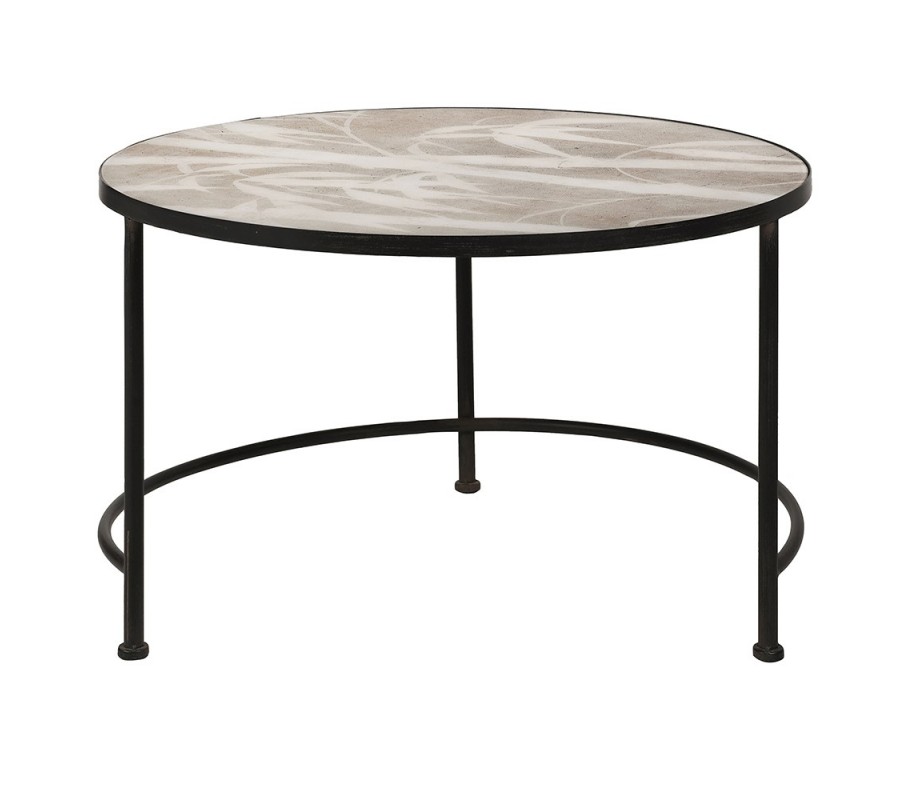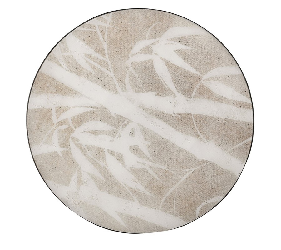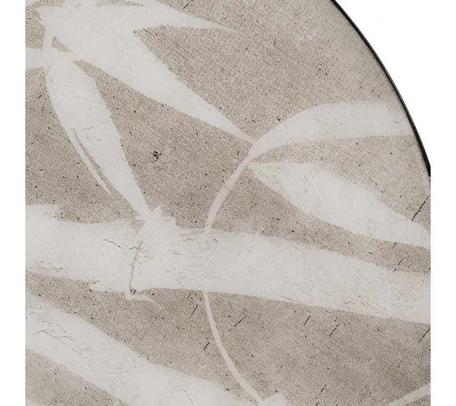 Farebná paleta stola je neutrálna a harmonická. Vrchná doska kombinuje odtiene béžovej a bielej, zatiaľ čo podstava je vyhotovená v kontrastnej matnej čiernej farbe. Dekoratívny biely motív bambusových lístkov na vrchnej doske je výrazným dizajnovým prvkom, ktorý dodáva stolu jemný umelecký charakter.
