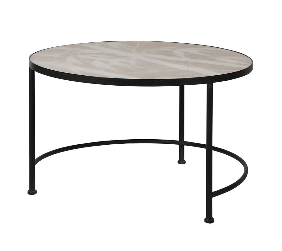 Dizajnový moderný okrúhly konferenčný stolík Ambri s béžovou vrchnou doskou s bambusovým vzorom a čiernou podstavou 80 cm