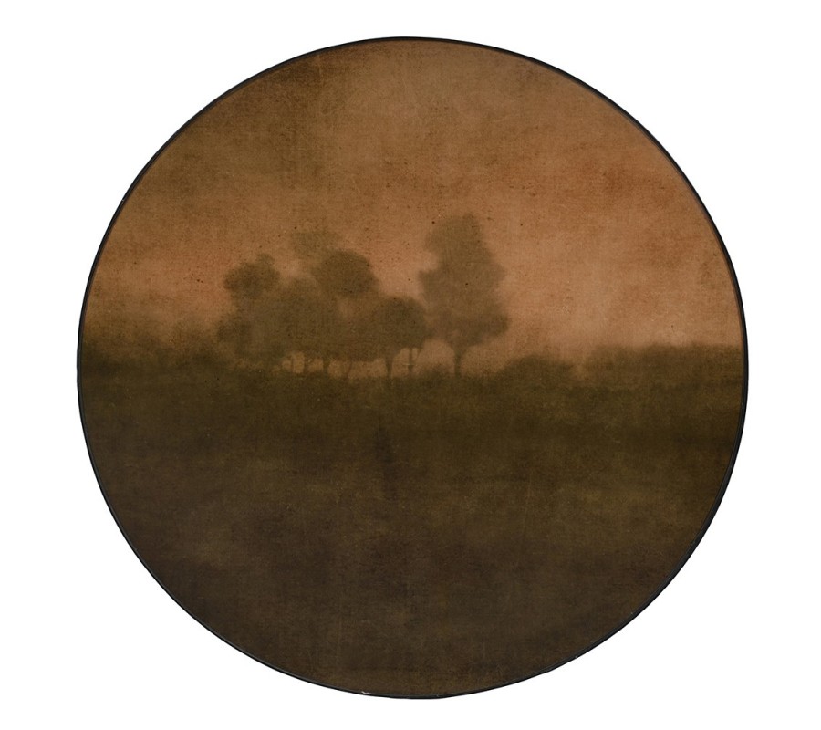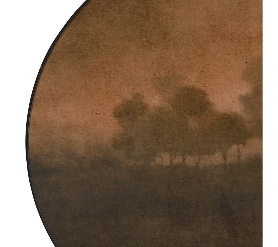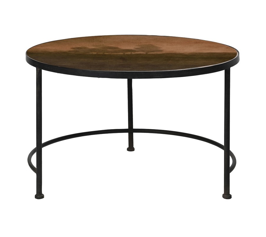 Konferenčný stolík má okrúhlu dosku, ktorá je pokrytá skleneným povrchom, poskytujúcim ochranu a lesklý efekt. Pod sklom sa nachádza dekoratívna potlač s jemne zachyteným motívom krajiny, kde dominujú siluety stromov. Farebná paleta je ladená do teplých hnedých a zemito-zelených odtieňov, ktoré vyžarujú prírodný a harmonický dojem.