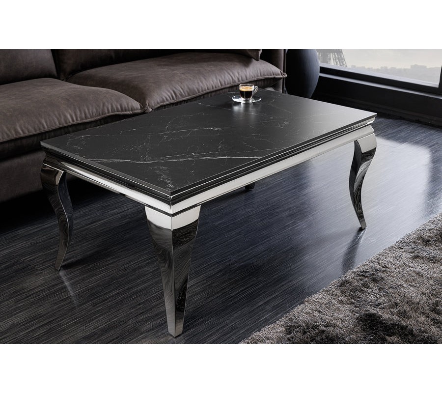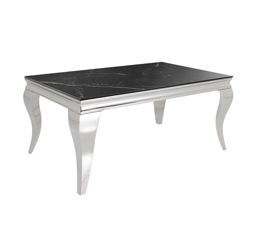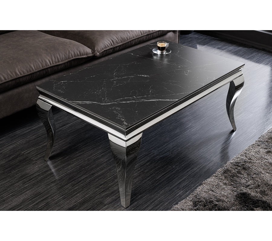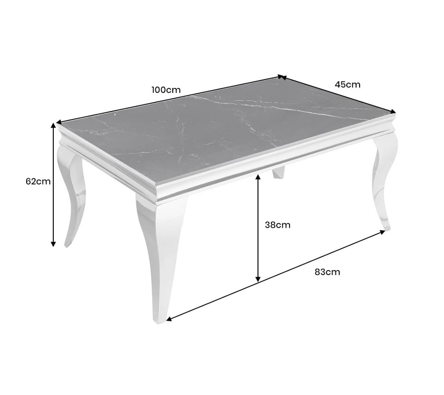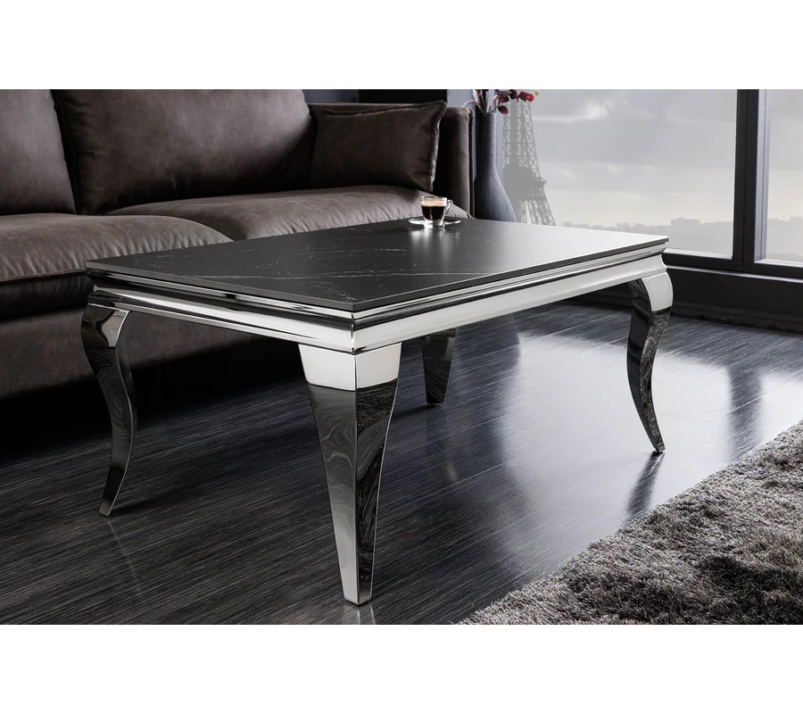 Konferenčný stolík predstavuje kombináciu moderného dizajnu s prvkami baroka. Chrómovaný povrch rámu dodáva lesklý, luxusný vzhľad, pričom jeho elegantné, mierne zakrivené nohy pripomínajú klasické barokové línie. Tvar stolíka je obdĺžnikový, čo mu dodáva praktickosť a všestrannosť.