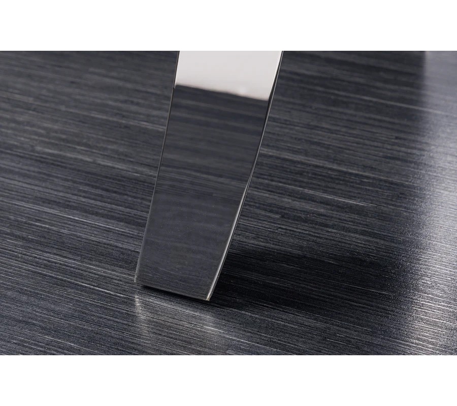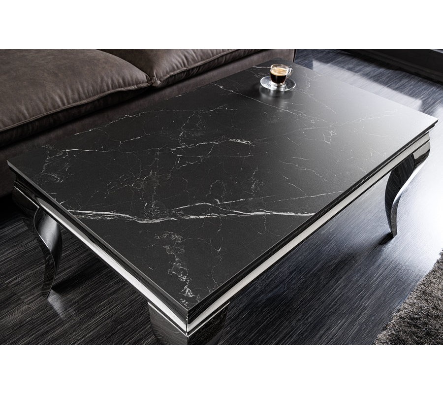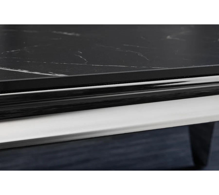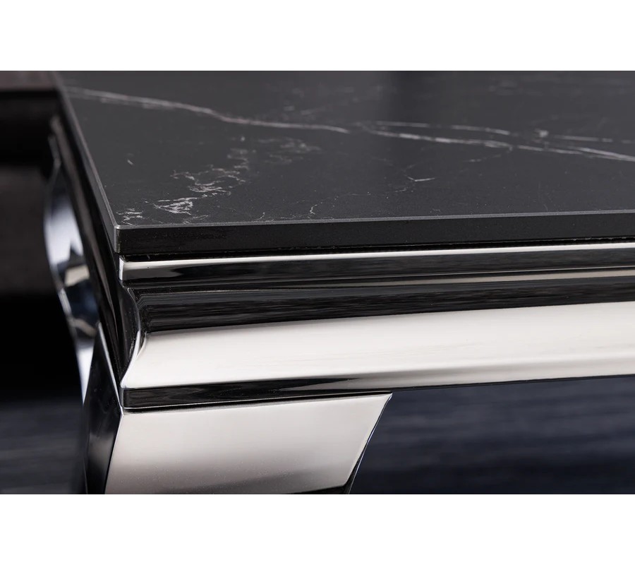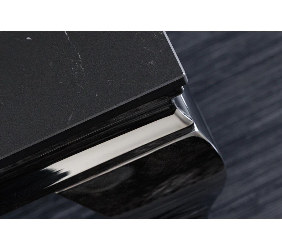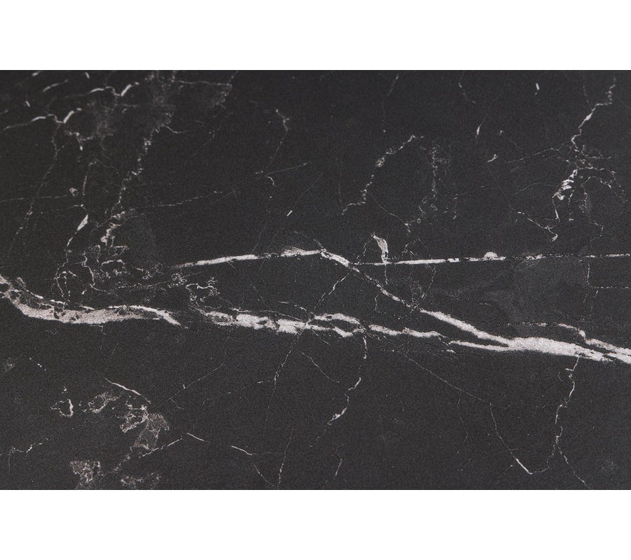 Vrchná doska má čierny mramorový dizajn s jemnými bielymi žilkami, ktoré pridávajú na estetike a elegancii. Povrch dosky je hladký a matný, čo kontrastuje s chrómovaným rámom a zvyšuje sofistikovaný dojem.
