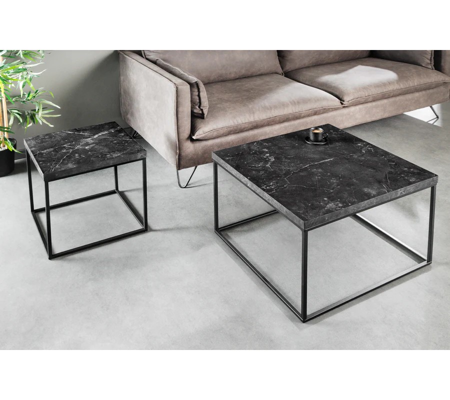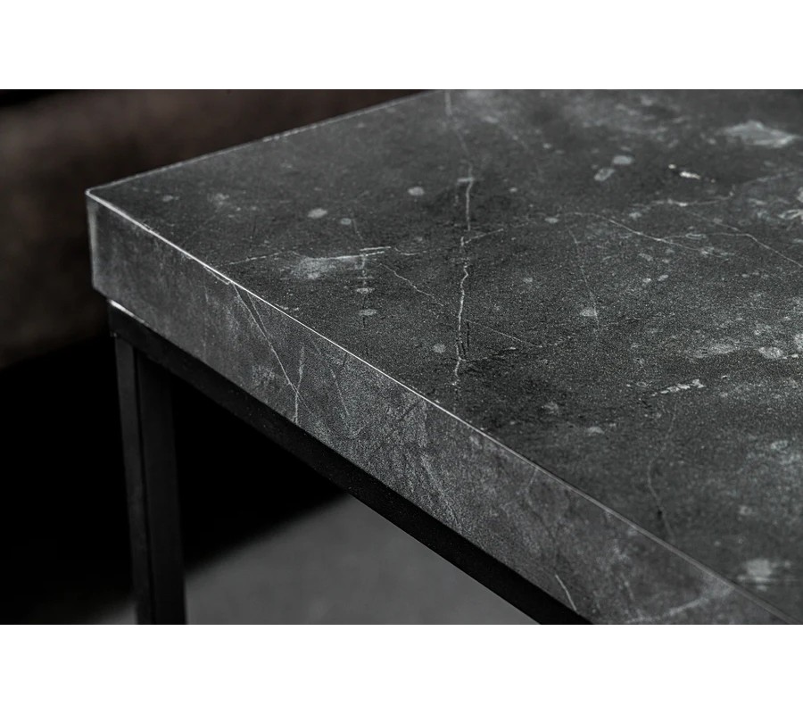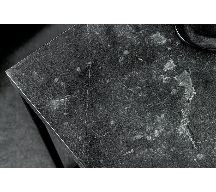 Vrchná časť stolíka disponuje doskou s povrchovou úpravou imitujúcou čierny mramor. S jemnými bielymi žilkami dodáva stolíku sofistikovaný a luxusný charakter. Povrch je mierne štruktúrovaný a matný, čím zvýrazňuje autentický vzhľad mramorového dekoru. Táto priznaná textúra je typická pre industriálny štýl.